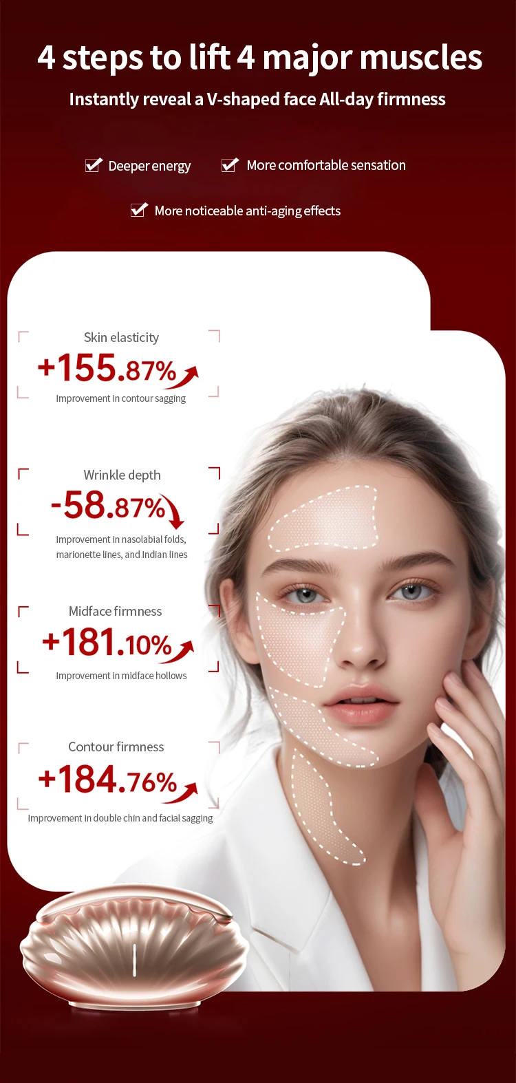 V‑VIFT Mode: Yellow light + EMS + heat for rapid facial lift and firming.