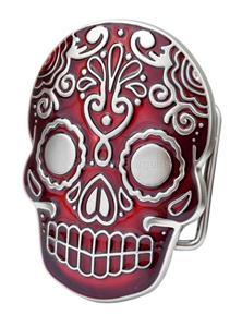 This is a high quality Red colored Sugar Skull or Mexican Katrina Dia De Muertos ("Day of the Dead") Belt Buckle. The buckle is made in zinc alloy. It fits a standard 1.5 inch snap on belt. This buckle measures 2.5" by 3.5" by 0.25". Crafted well enough for the collector to display and durable enough to be worn.