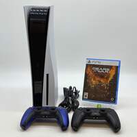 Sony PlayStation 5 Disc Edition PS5 825GB White CFI-1015A 2 Controllers Bundle Items included in this sale: Sony PlayStation 5 Disc Edition PS5 825GB White Console Gaming System CFI-1015AHDMI CableControllerPower CableBlue PS5 ControllerBlack PS5 ControllerGears of War RELOADED *Please note, if it is not listed it is not included - such as power cables or other accessories. Specifications: Collection Sony Gaming Sub-Collection Sony Consoles Brand Sony Model PlayStation 5 Disc Edition PS5 Platform Sony PlayStation 5 MPN CFI-1015A Storage Capacity 825GB Condition Good Type Console Gaming System MFG Warranty? No Software Version Latest Color White Has a Disc Drive Yes UPC 711719541028 Serial# AJ146543843 Cosmetic condition: The console is in good pre-owned condition with a few noticeable scuffs, scratches, and wear. The top of the console is in good shape with a few minor, but noticeable, marks. The bottom of the console is in good shape with some minor, but noticeable, scuffs and wear. See pictures for more details on condition. Please view our close up photos, as these are taken of the actual item being offered for sale. Functionality condition: The console turns on and off properly, The console accepts and reads game discs. The eject button works perfectly. All ports work properly and are clean. The device has been reset and all accounts have been removed. (Controllers are included as is)