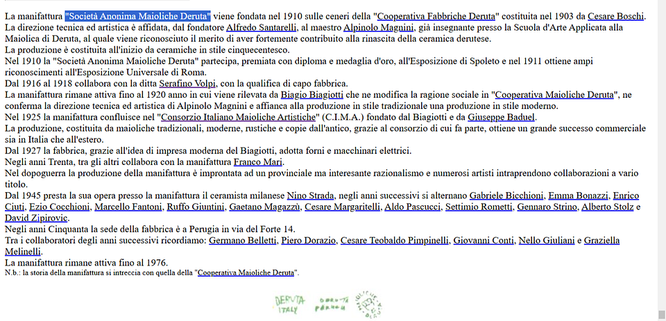 La manifattura Maioliche Deruta, è una delle più antiche manifatture Derutesi, fondata nel lontano 1910. La direzione tecnica della manifattura è gestita da Alfredo Santarelli e dal maestro Alpinolo Magnini, al quale viene conferito il merito di aver fortemente contribuito alla rinascita delle ceramiche Derutesi. Nel 1925 la manifattura conferisce nella Cima e cambia la sua ragione sociale. La manifattura vanta la collaborazione di molti importanti artisti italiani e svariati risultati d'asta. Nelle ultime foto abbiamo messo nozioni storiche aggiuntive sulla manifattura per chi volesse approfondire.