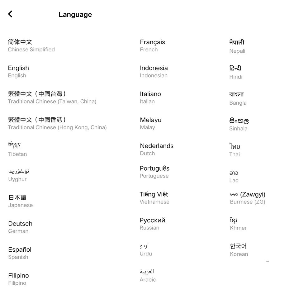 Chinese, English, Filipino, French, German, Spanish, Portuguese, Italian, Dutch, Vietnamese, Russian, Nepalese, Hindi, Bengali, Thai, Lao, Tibetan, Arabic, Malay, Japanese, Korean |