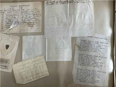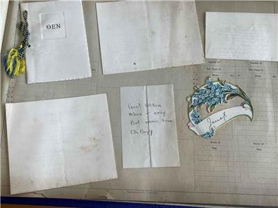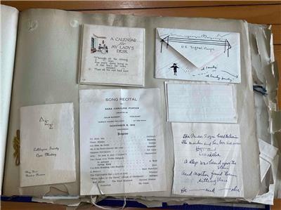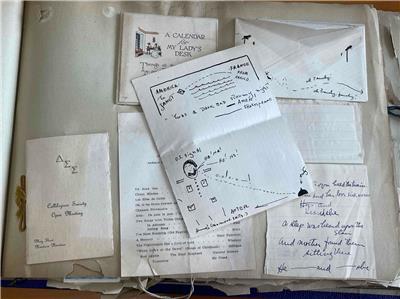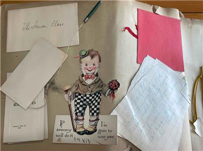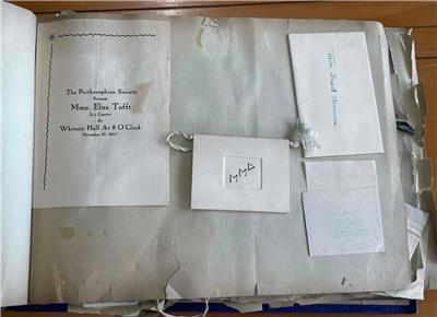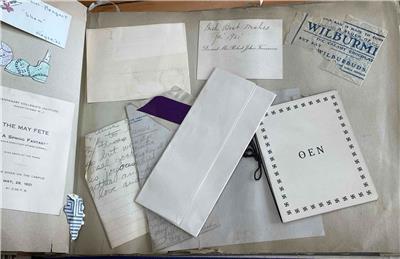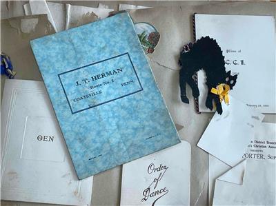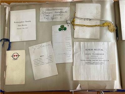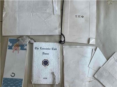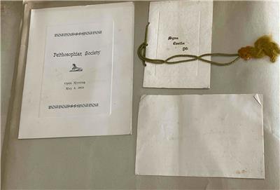 Hundreds of pieces of ephemera including dance cards, play programs, invitations, greeting cards, hand-drawn pictures, recitals, advertising, Peithosophian Society correspondence, letters, a few photos and postcards.