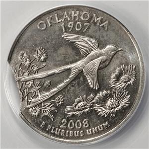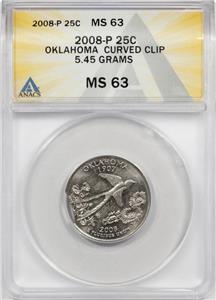 You are bidding on a 2008 ANACS MS63 Curved Clip Oklahoma Quarter Mint Error Very Rare. Errors are becoming very rare as the mint has put in systems in 2002 to virtually stop all majors errors from getting out of the mint. Please check my very positive feedback. Shipping and handling $2.95. Please check out my other ERROR COIN Auctions this week.