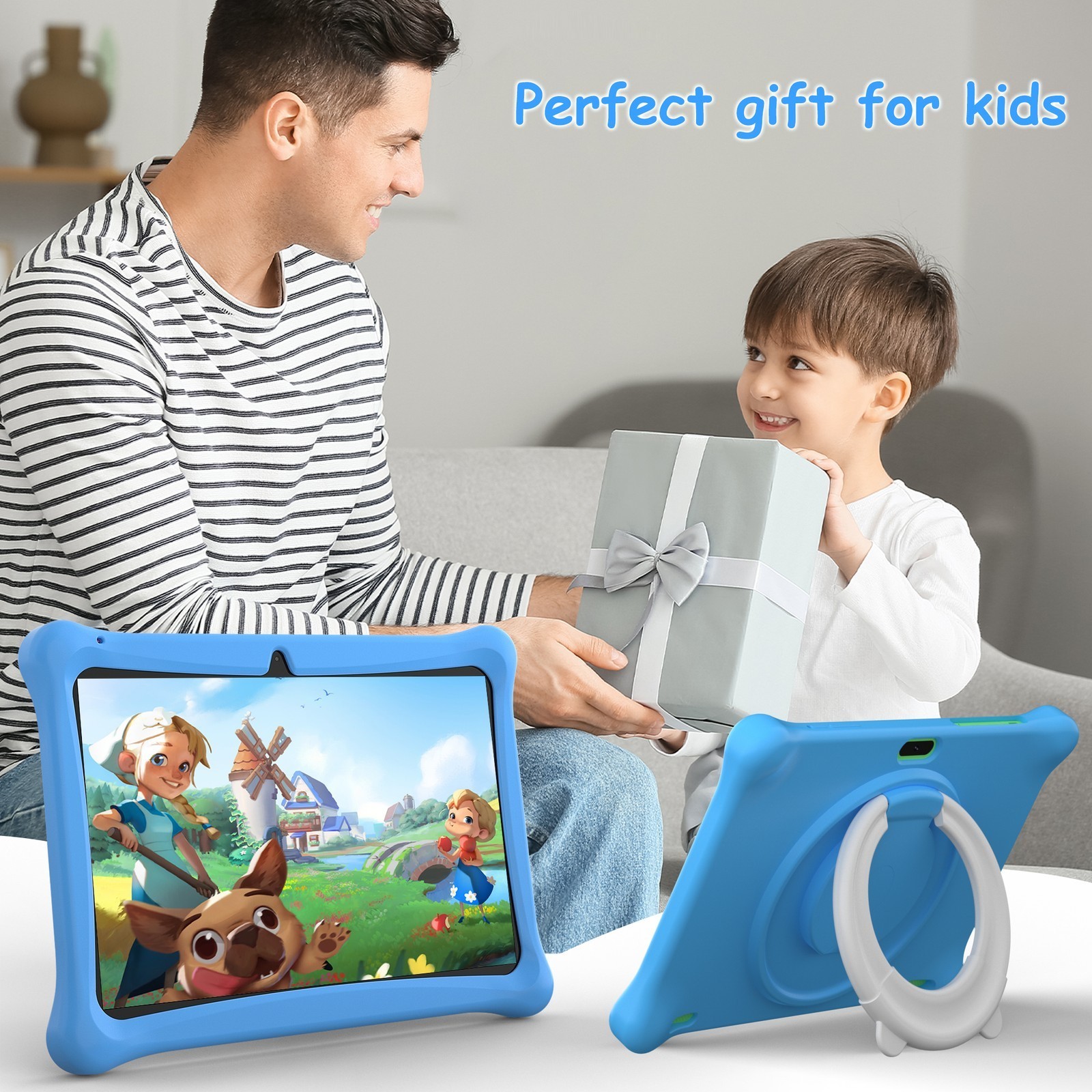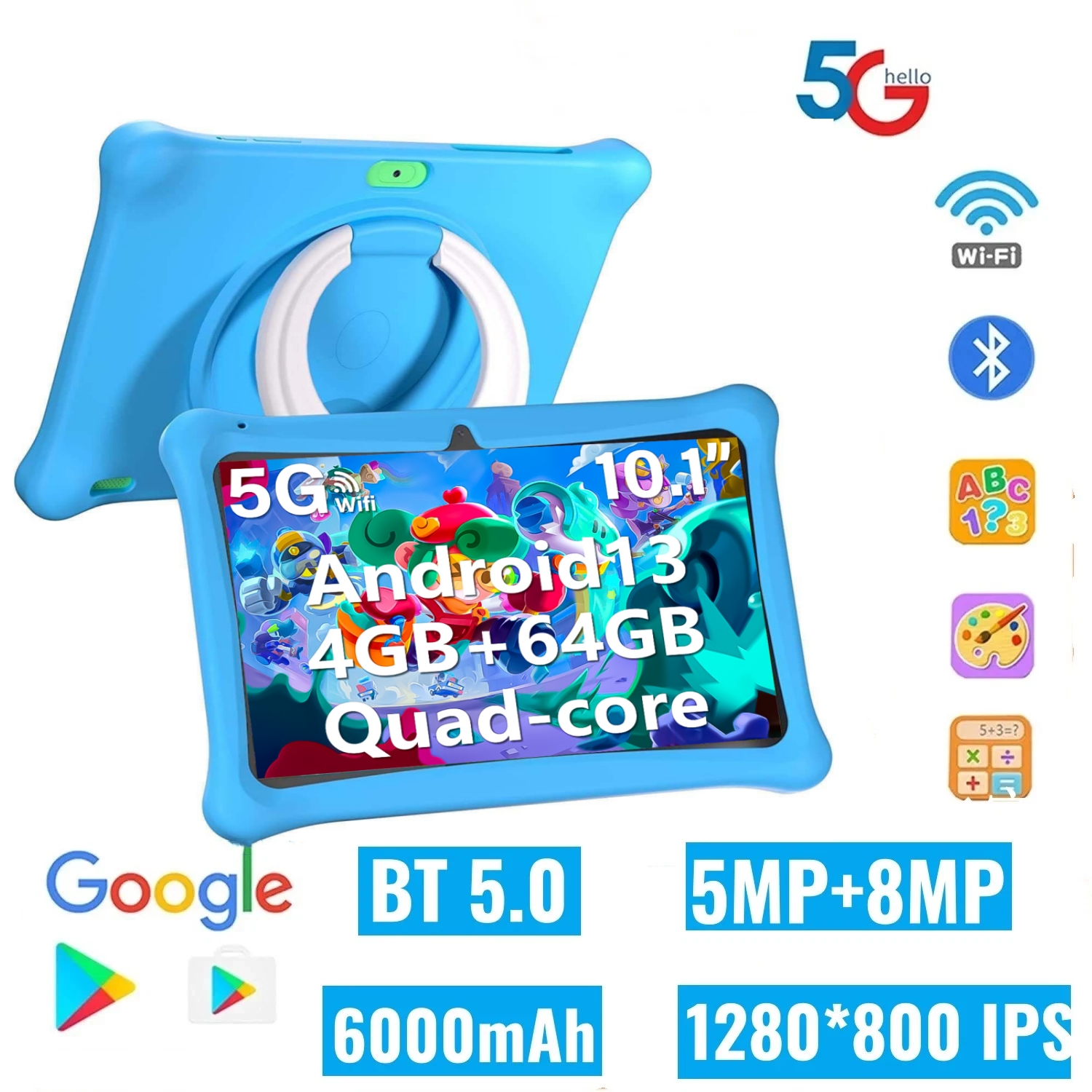 【New Edition Kids Tablet 10.1-inch with Protective Case】SGIN All-in-One Kids Tablet 7-inch Toddler Tablet runs the latest Android OS, features 2.4GHz WiFi, Bluetooth, and a powerful quad-core processor. It delivers 40% faster app launches and page loading with smoother performance while blocking intrusive ads. Equipped with 4GB RAM and 64GB storage, it holds vast amounts of photos, music, and videos. This Android kids' tablet is GMS certified, supporting downloads of educational and entertainment apps from Google Play. With all-day battery life—up to 10 hours of continuous gaming, e-book reading, or cartoon watching—it's the perfect companion for long trips, flights, and daily learning.