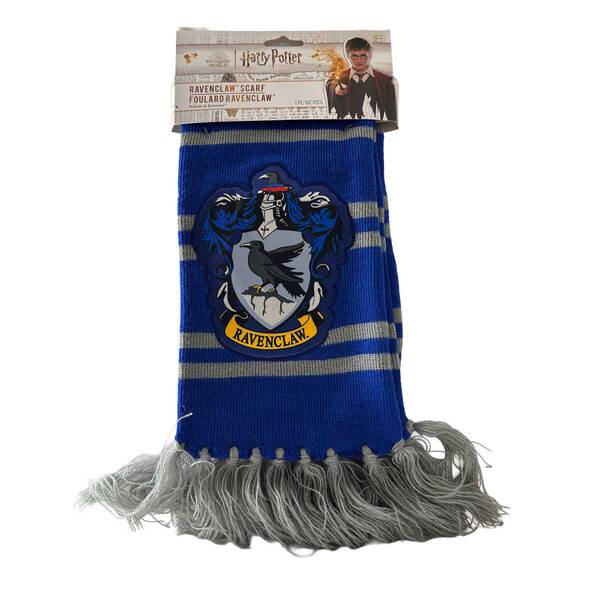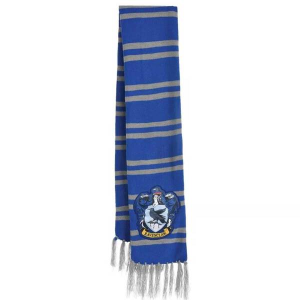 The scarf is Ravenclaw colors, royal blue with grey double stripes with a large, detailed Ravenclaw crest patch featuring the house mascot. The double-ply knit is warm and comfortable for everyday wear. Classic fringed ends give an authentic Hogwarts look.