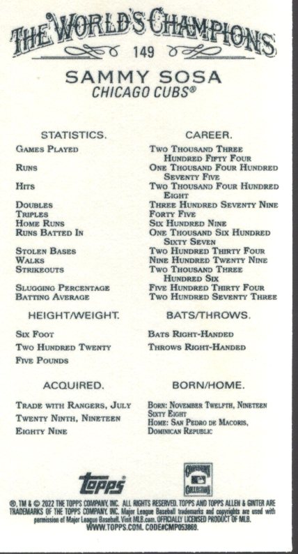 2022 Topps Allen and Ginter Mini #149 Sammy Sosa - BB