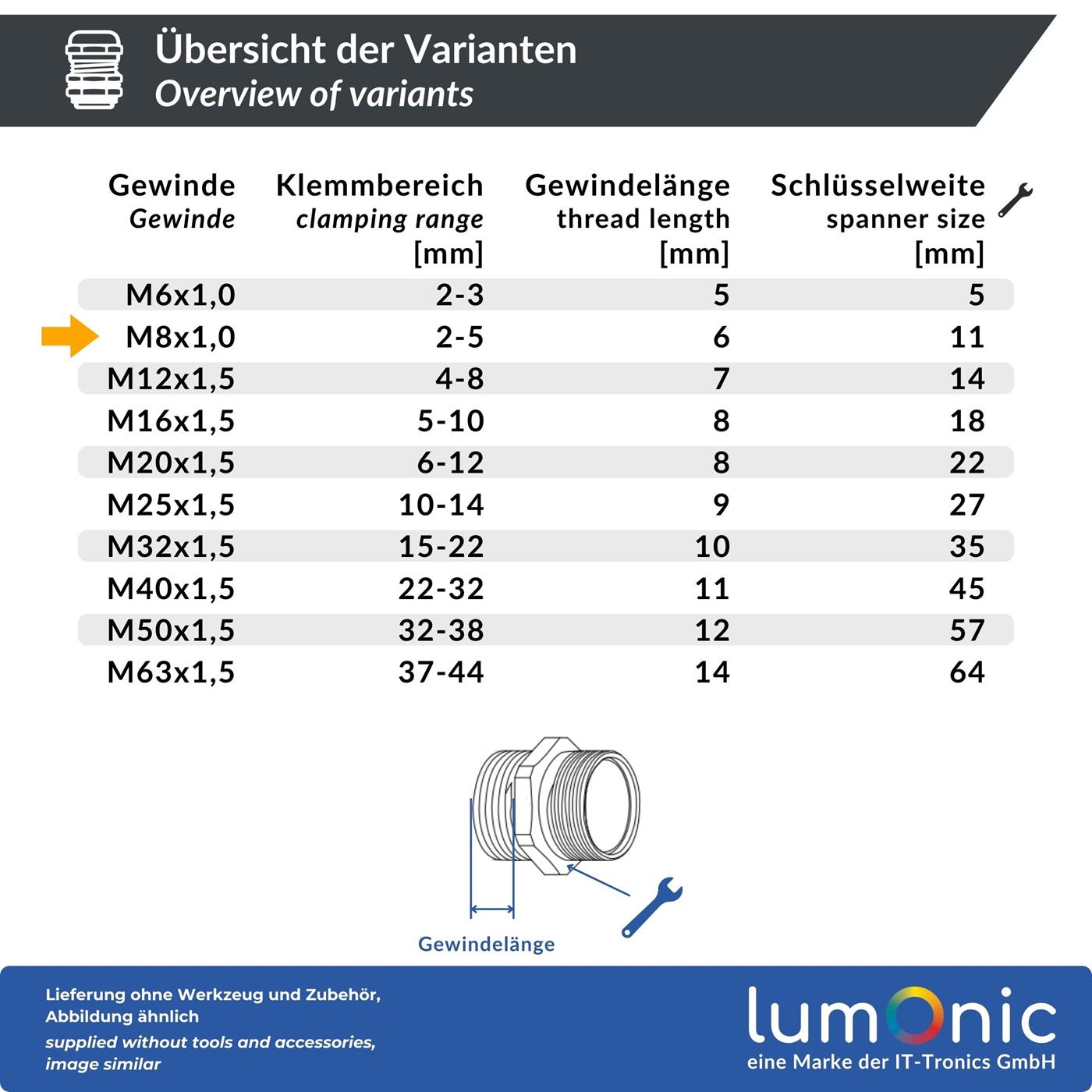 5er Set Kabelverschraubung Metall M8, Klemmbereich 2-5mm, IP68, mit Gegenmutter, Messing vernickelt, EMV, -40…+100°C