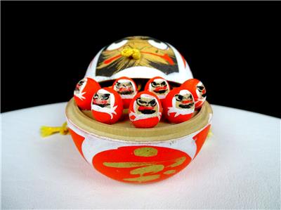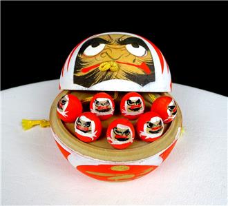 This is in Excellent Condition with No Chip No Cracks. Very Nice Japanese Carved Wood Kokeshi Doll. This depicts Bodhidharma, the founder of Zen Buddhism, and typically shown as a red robed bearded man. He has an expressive face, wide nose, and painted eyes, eyebrows, and beard. This opens up to reveal 7 smaller figures inside. This is seen as a symbol of perseverance and good luck.