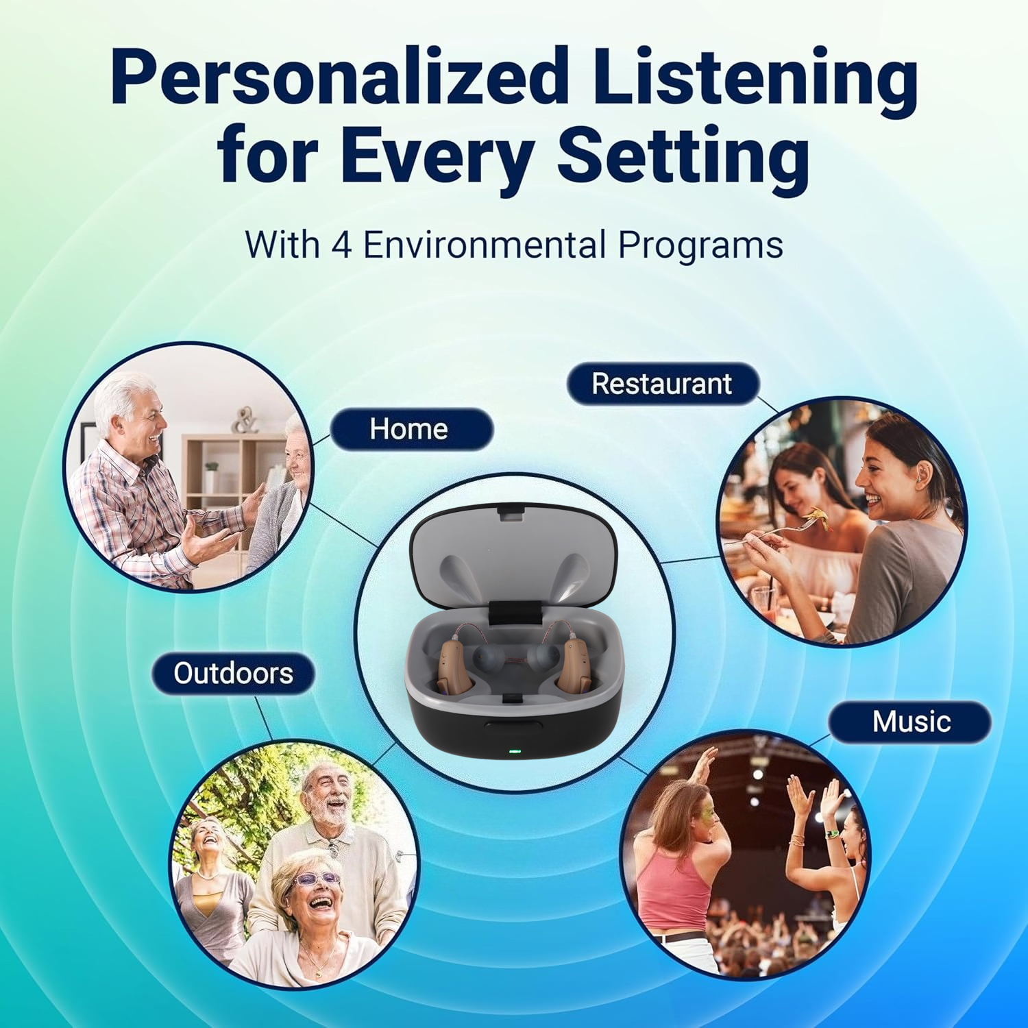Our hearing aids feature advanced ONSEMI smart chips and dual-microphone technology designed for multi-directional noise reduction.