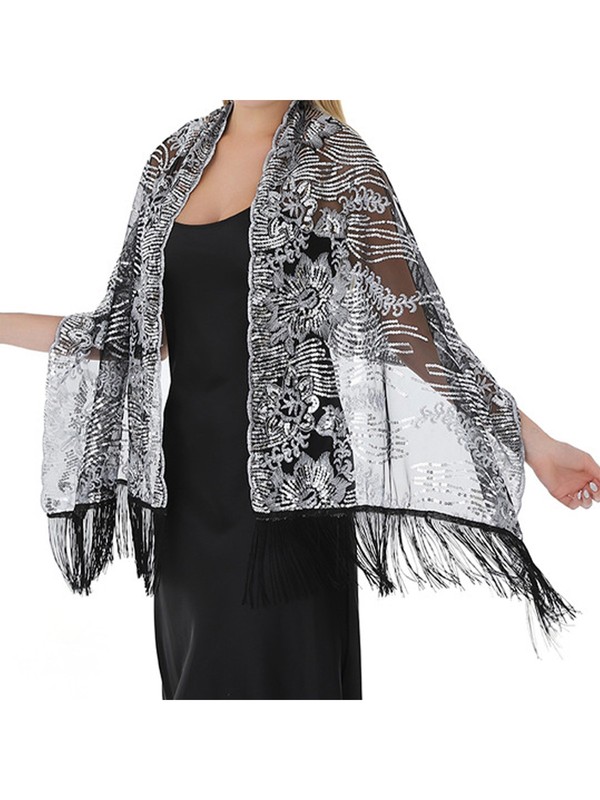The shawl features a sequin flower and fringed design, adding a touch of glamour and sparkle, which is very trendy.