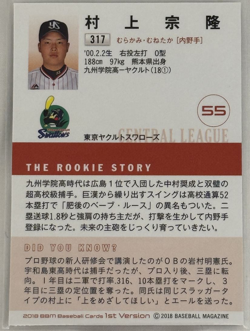 2018 BBM 1st Version Munetaka Murakami Rookie #317 a
