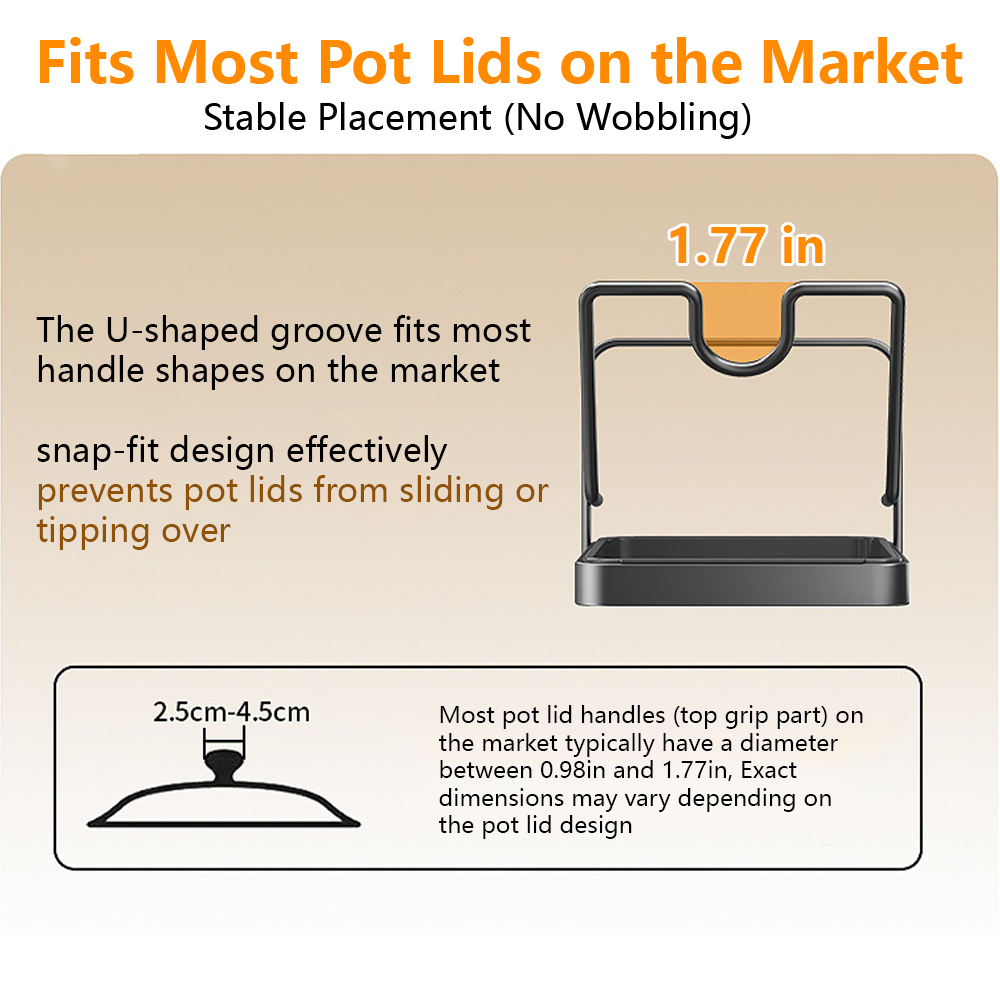 Holds lids securely upright in dedicated grooves—keeps them stable, visible, and within easy reach while freeing up valuable kitchen surface area.