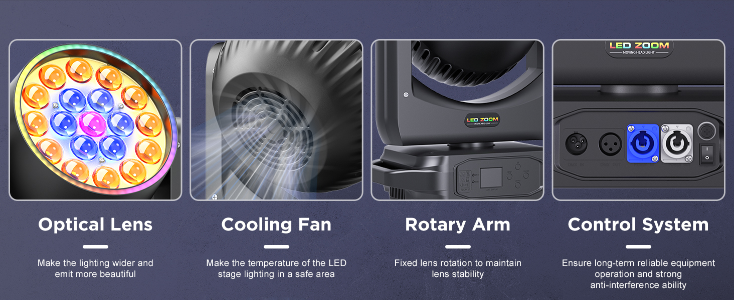 Rocking Head Function: The focusing and dyeing rocking head is equipped with a rocking head function, which can realize horizontal and vertical rotation and scanning motion. Through the console or automatic program, you can set the range and speed of the fixture's panning head movement, allowing the lights to scan and display flexibly on the stage or venue.