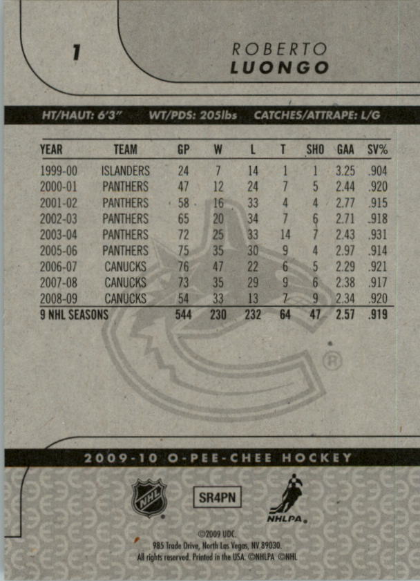 2009-10 O-Pee-Chee #1 Roberto Luongo - HKY