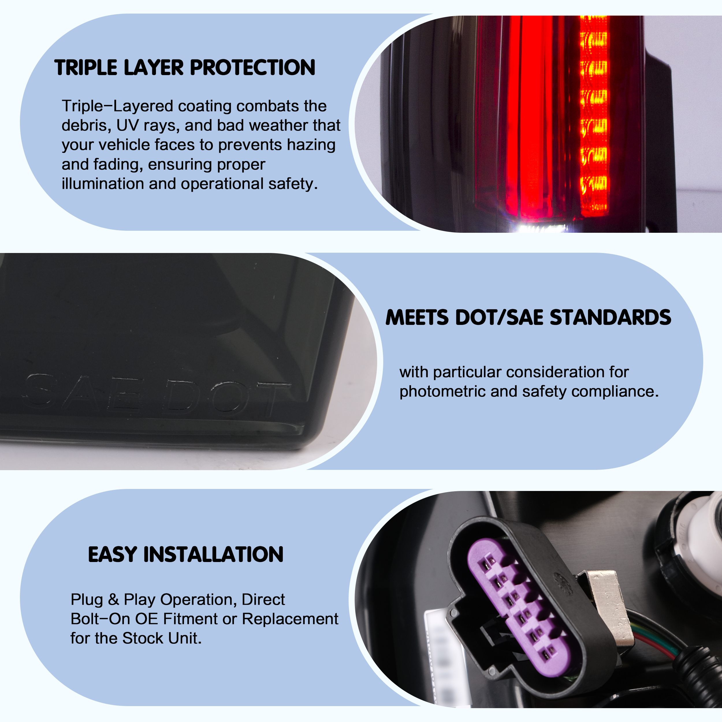 Nous répondons à toutes les questions dans les 24 heures, sauf le week-end et les jours fériés. Nous vous servirons en toute sincérité ! Remarque : Veuillez vérifier si ces feux de voiture peuvent s'adapter à votre voiture avant d'acheter, si vous n'êtes pas sûr, veuillez nous contacter. L'utilisation de votre connecteur/harnais fourni par l'usine évitera de couper ou de modifier des fils. Les avantages de la LED vous rendent plus sûr sur la route pour les autres usagers de la route à voir.