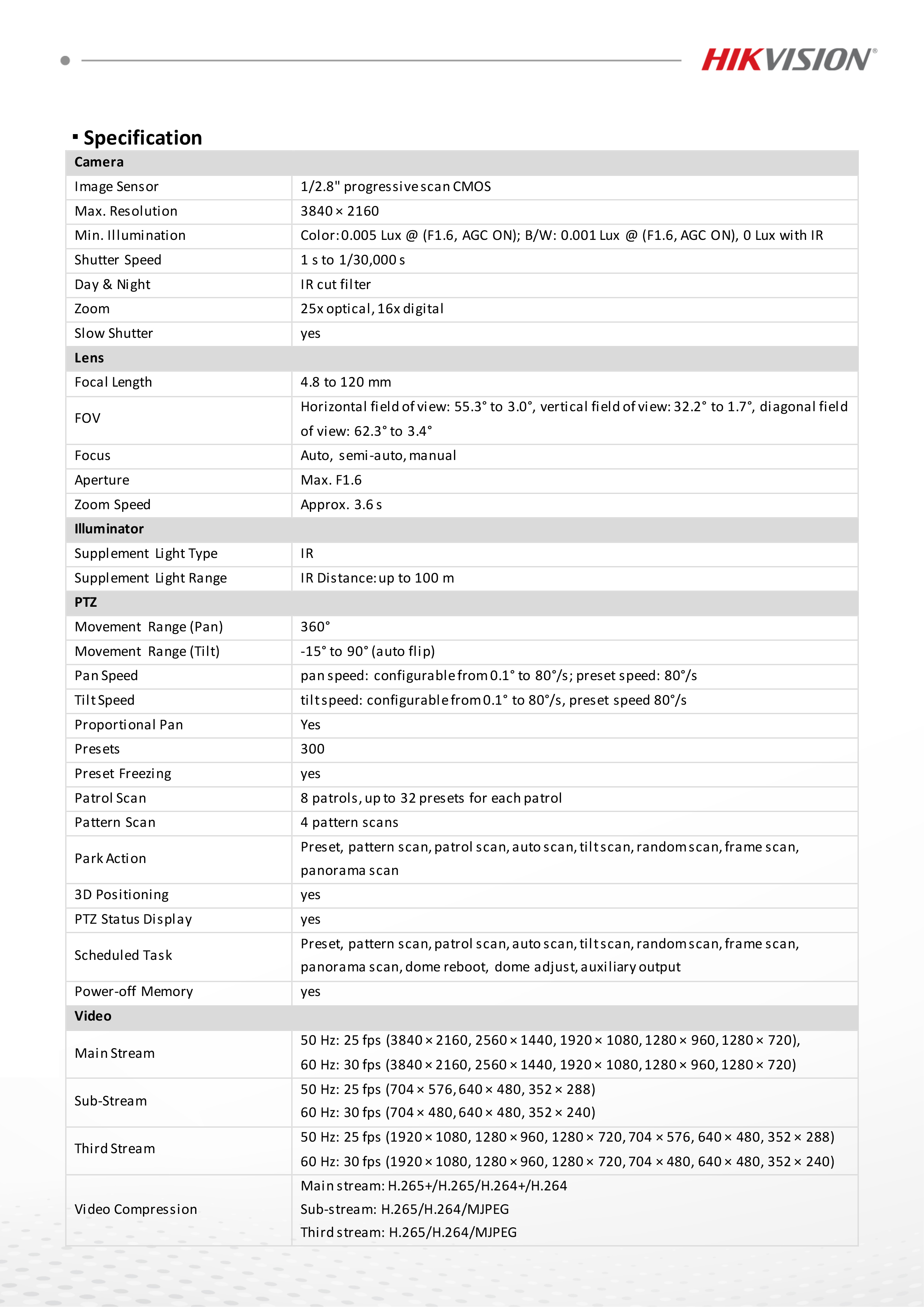 Hikvision DS-2DE4825IWG1-E 8MP 25× Network IR Speed Dome adopts 1/2.8" progressive scan CMOS chip. With the 25× optical zoom lens, the camera offers more details over expansive areas.