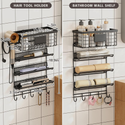 Upgrade your bathroom storage with this wall-mounted 5-in-1 hair styling tool organizer designed for maximum convenience and space-saving efficiency. Built with high-quality carbon steel, this durable organizer features three shelves, a storage basket, a dedicated hair dryer holder, and five hooks—perfect for managing hair dryers, brushes, curling irons, straighteners, hot tools, and daily toiletries.