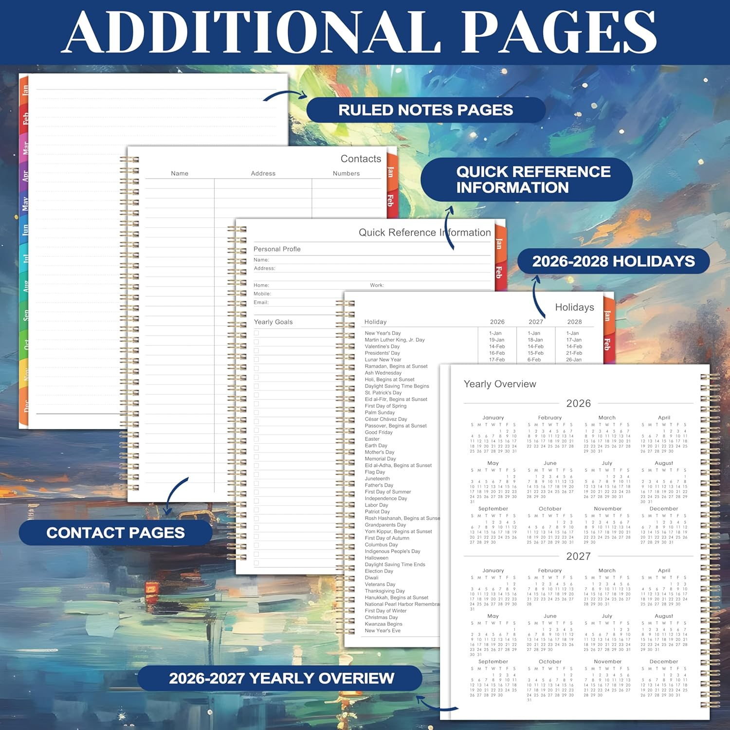 Added Features for Better Organization: This planner includes a list of holidays for 2026, 2027, and 2028, a two-year overview (2026-2027), contact pages, quick reference information, and notes pages, offering everything you need in one place.