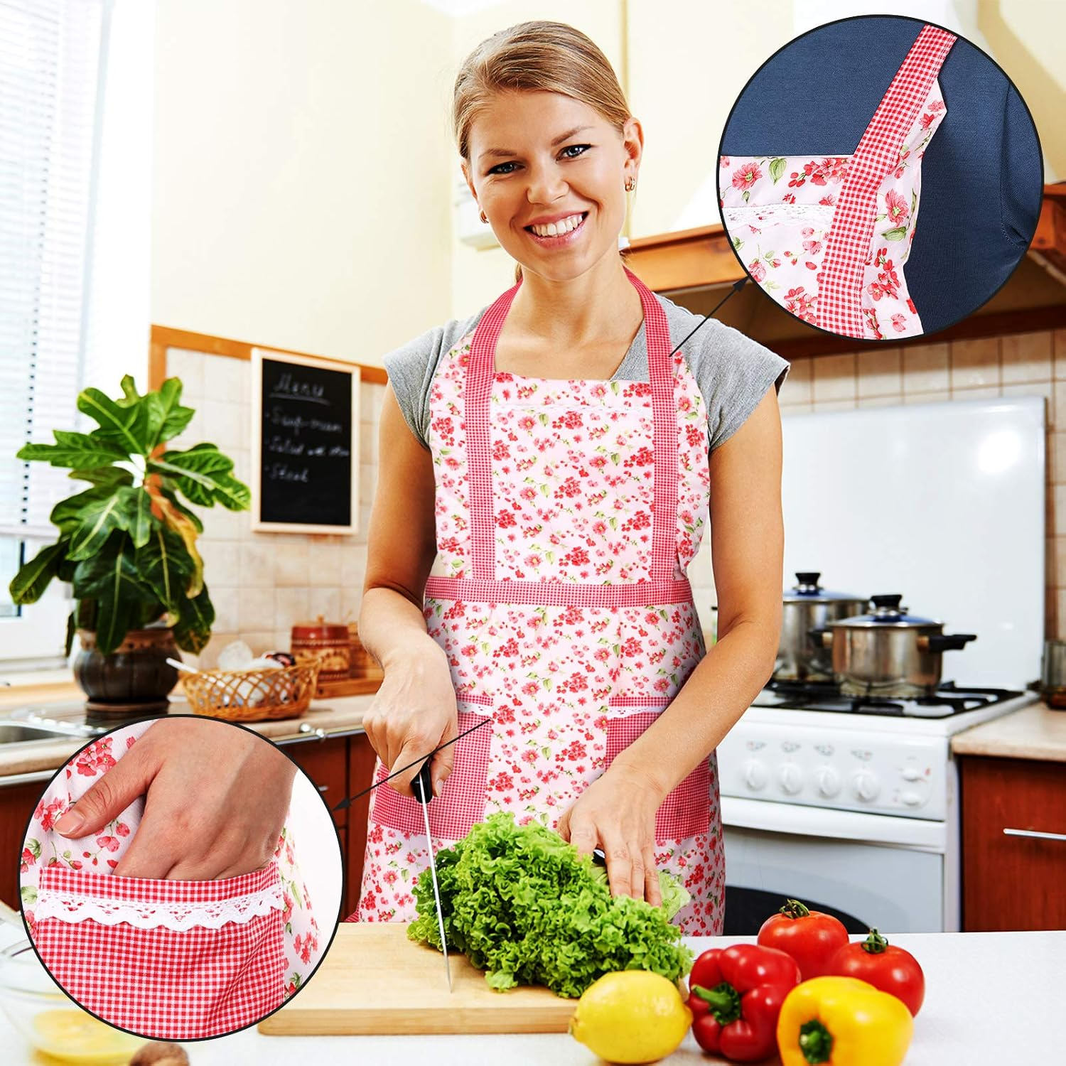 Colors may slightly vary depending on screen display, but each apron matches the floral design shown.