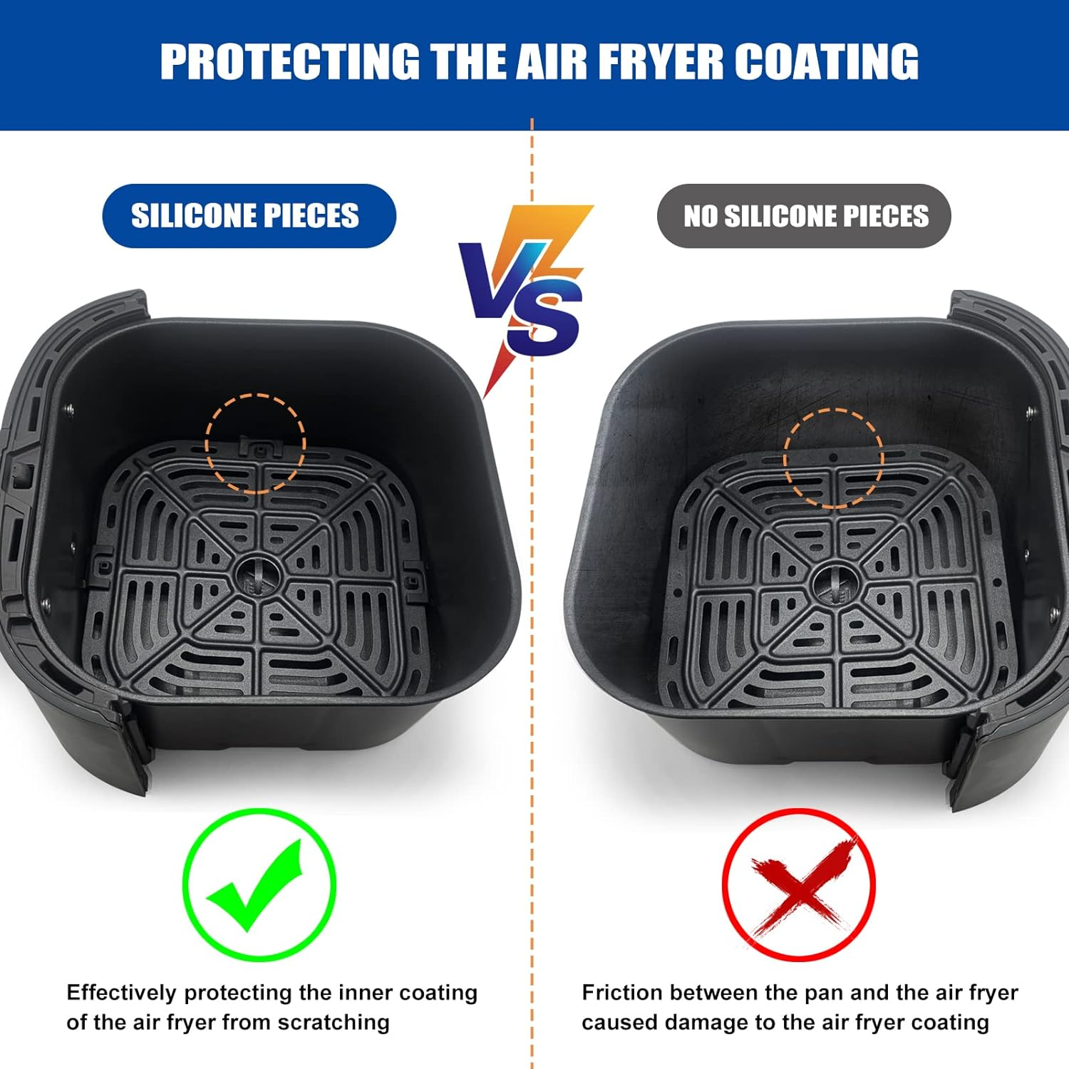 Prevent costly damage to your air fryer basket and tray. These silicone tips keep the metal from rubbing directly against the fryer’s inner surfaces, preventing scratches and wear and tear. If your silicone pads become damaged, you won’t need to replace the entire tray—just swap out the bumpers for a budget-friendly fix.