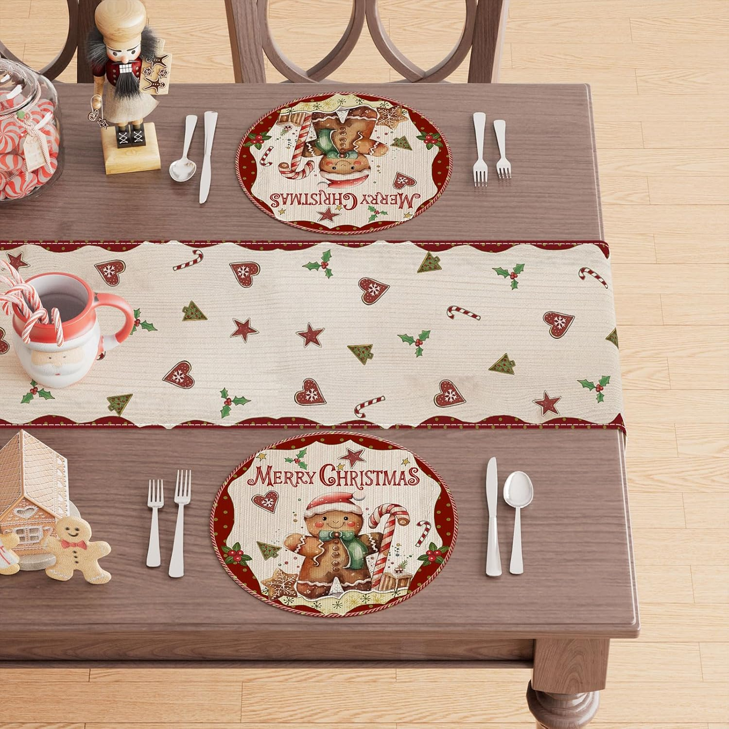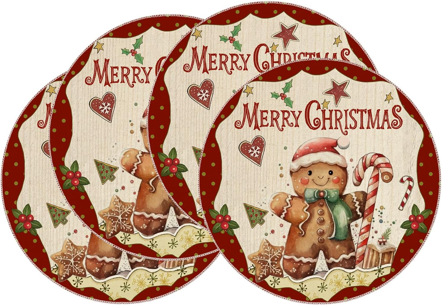 Bring warm holiday charm to your dining space with this Merry Christmas gingerbread man round placemat set. Designed to elevate your winter table décor, these festive table mats are perfect for Christmas dinners, parties, family gatherings, restaurants, and seasonal home decoration.