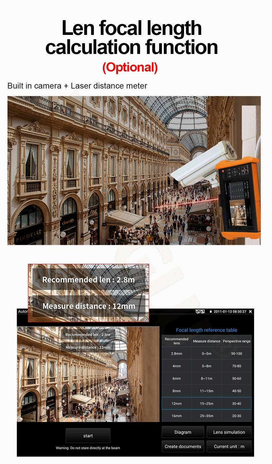 ● Lens focal length calculation, recommend lens by testing and monitoring the distance, display real-time images, simulating the display area of different lens sizes of 2.8 /3.6 /4 /6 /8 /12 /16 /25mm,for reference in lens purchase. (Optional) NEW