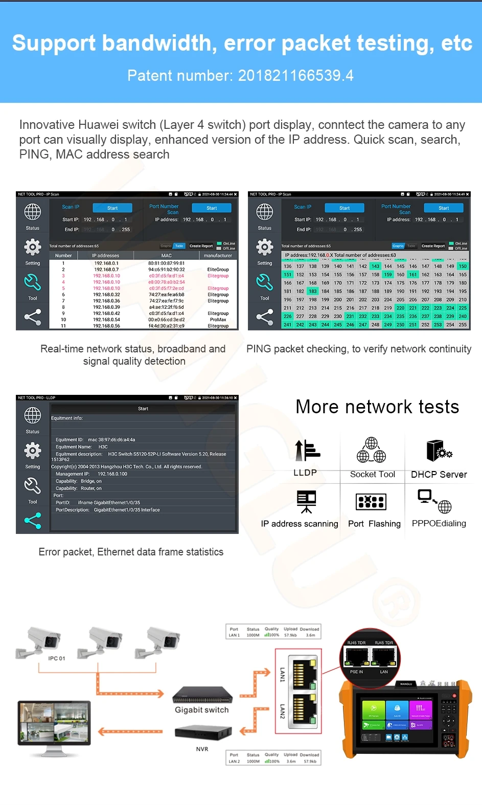● Built in Wi-Fi Analysis, support 2.4G/5G frequency band, can test Wi-Fi camera, create Wi-Fi hotspot