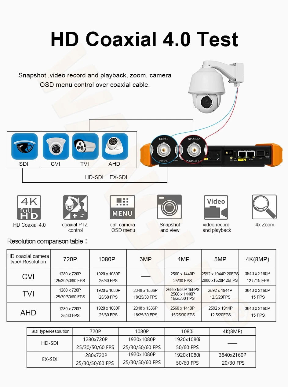 ● 8MP CVI test, 3840 x 2160P 12.5/15 FPS, 4xzoom, video record & playback, coaxial PTZ & call OSD menu