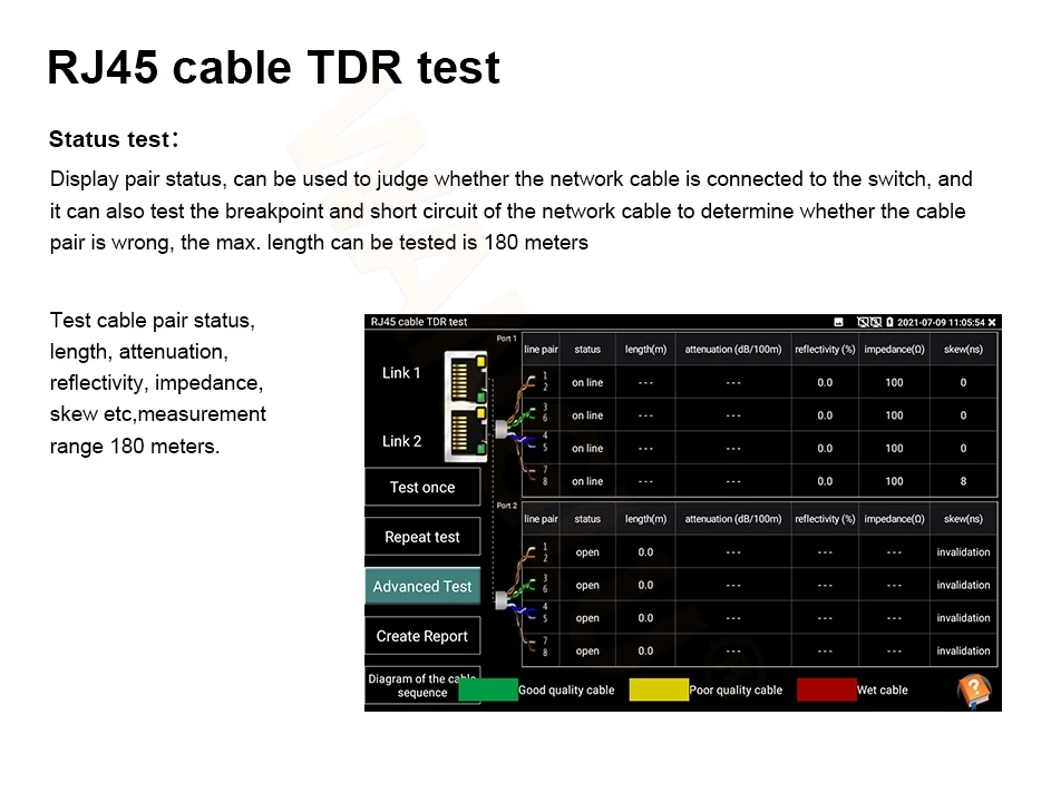 ● RJ45 cable TDR test, test cable pair status, length, attenuation, reflectivity, impedance, skew etc.