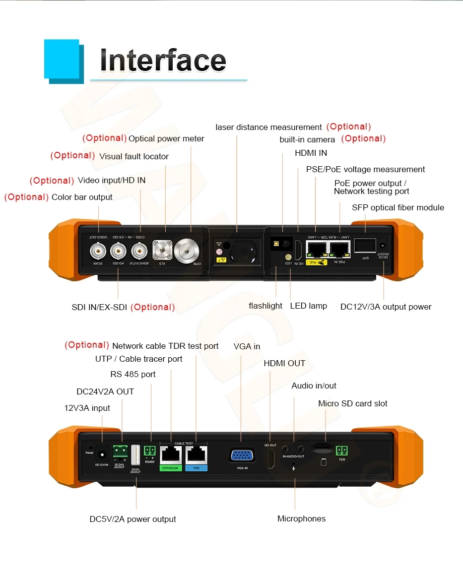 ● TDR cable test: BNC cable, network cable, telephone cable, RVV cable and elevator cable, cat 5/6 cable’s length and short circuit measurement range 1.2KM, Add TDR network port, it is convenient to test network cable. *(Optional)