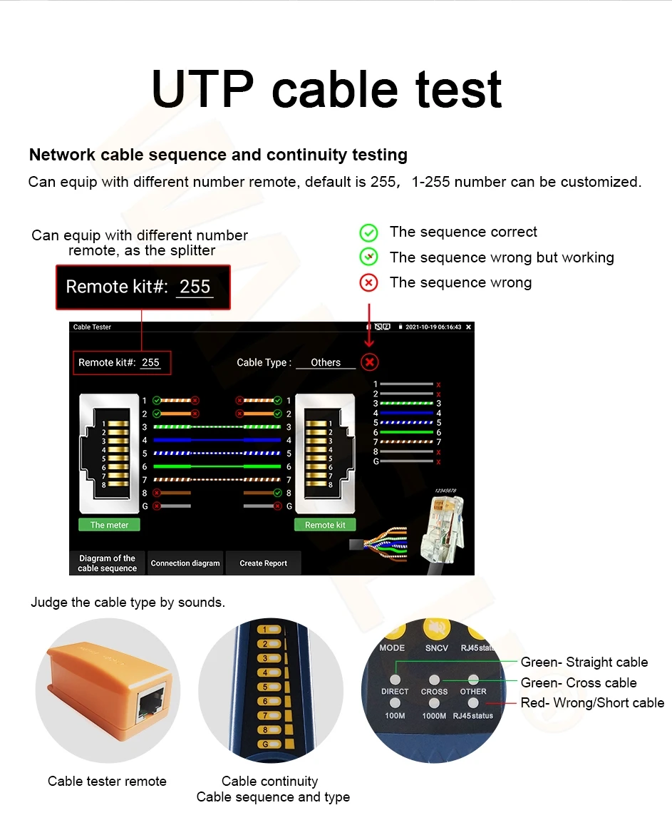 ● Improvement cable tester, UTP cable, telephone cable etc order and connectivity test, can save testing report, if special number, need customized,and detect near-end, mid-end and far-end fault test of RJ45 cable plug