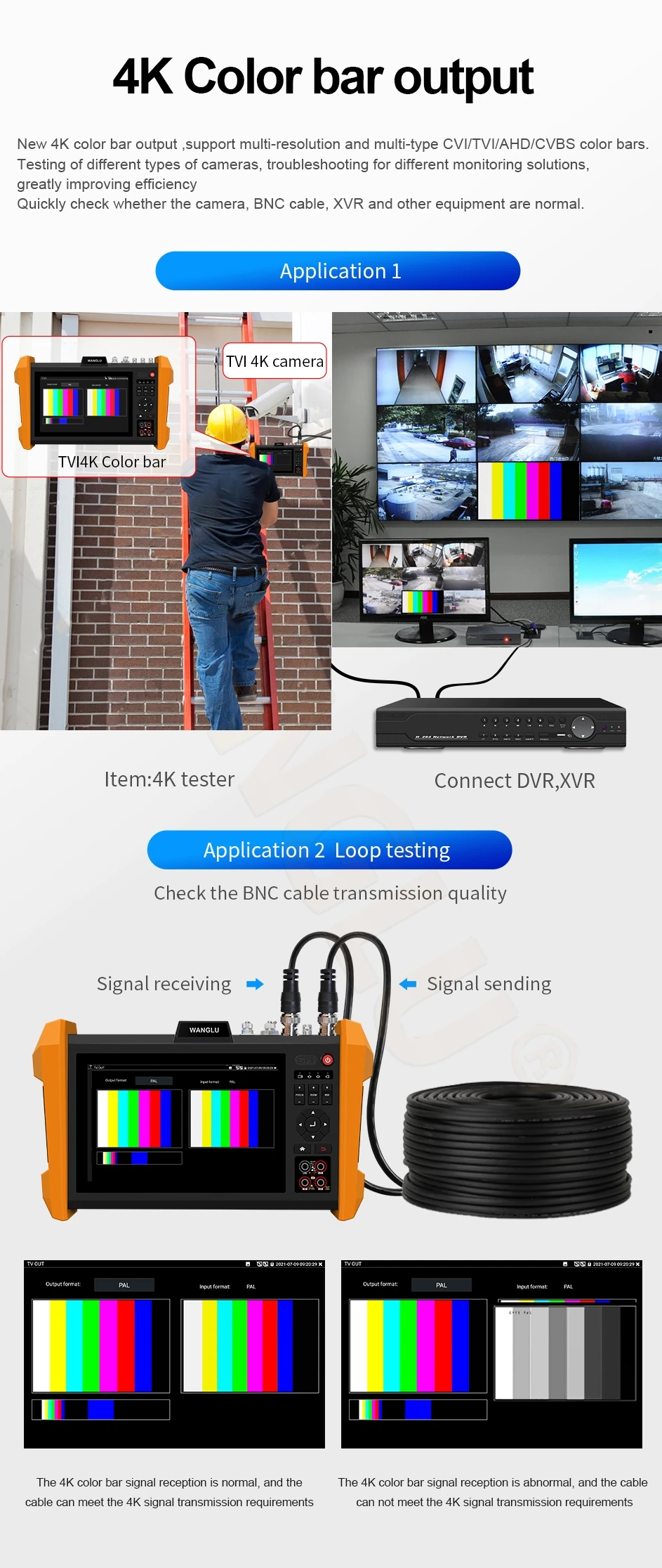 ● 4K color bar generator, send CVI/TVI/AHD/CVBS color bar video signal for testing monitor or video cable, support 4K resolution