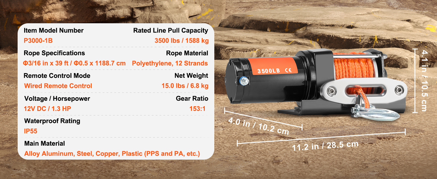 Our heavy-duty electric winch features a 3500 lbs line pull capacity and an IP55 waterproof rating, perfect for freeing your ATV or UTV from sticky mud pits. A 12V DC/1.3 HP permanent magnet copper motor, 153:1 gear ratio, and synthetic rope ensure you’re never stuck for long.