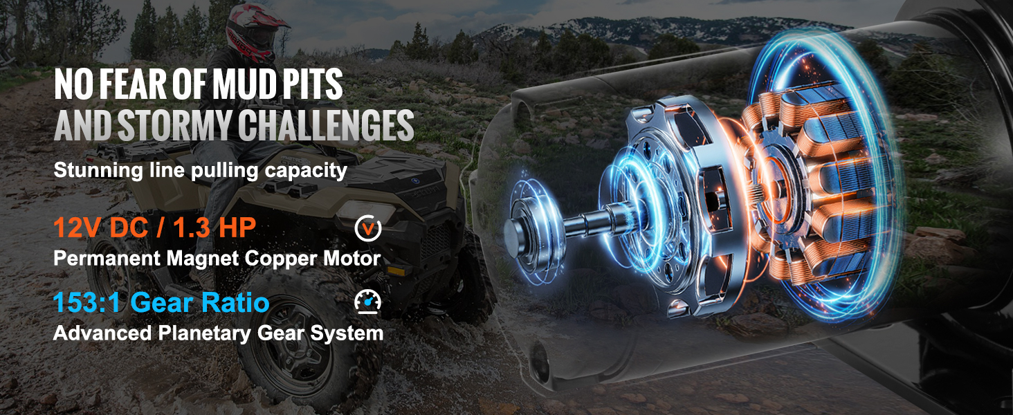 Our electric winch is powered by a robust 12V DC/1.3 HP copper motor, delivering consistent, efficient power every time. With an advanced planetary gear setup and a 153:1 gear ratio, you'll enjoy smooth, reliable line pull capacity even in harsh weather conditions or deep mud.