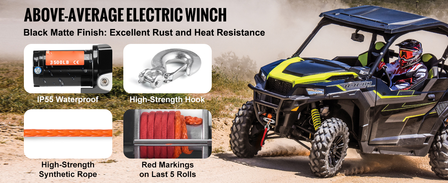 Weather-Resistant Performance: Constructed to withstand heavy rain, mud, and dust, this winch features an IP55 waterproof rating and a matte black finish for enhanced rust resistance. The color-coded power cables make setup a breeze, so you can get back on track with minimal effort.