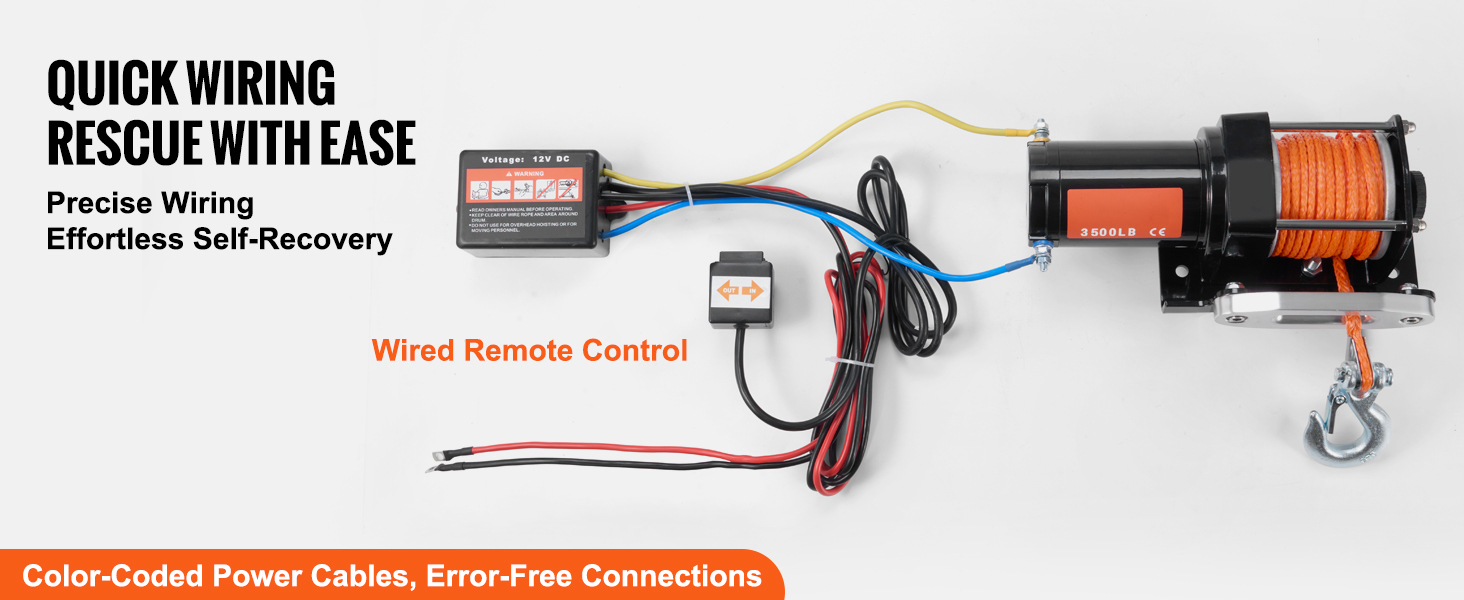 Say goodbye to wiring confusion! Our 12 volt winch features color-coded power cables for quick and error-free setup. With the wired remote control, simply connect the power lines and you're all set for smooth, efficient vehicle recovery.