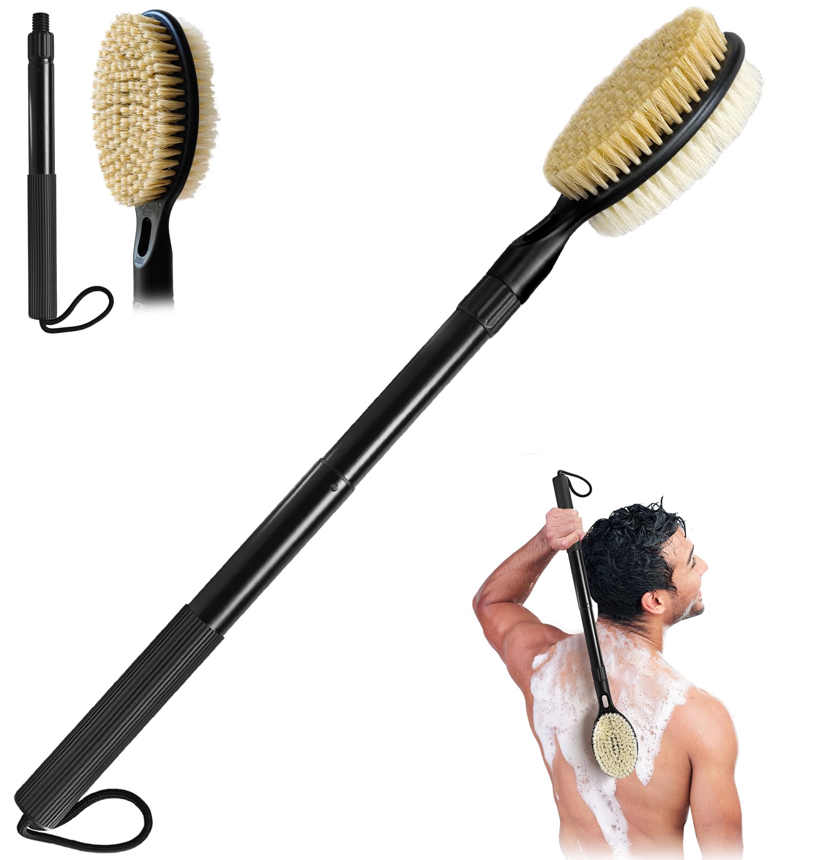【Premium Aluminum Alloy Handle – Lightweight, Rustproof & Durable】- Crafted from high-quality aluminum alloy, this extendable back brush is both lightweight and strong, ensuring long-lasting use. Compared to wooden or plastic bath brushes, this shower back scrubber stays clean and maintains a sleek, modern look that complements any bathroom.