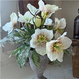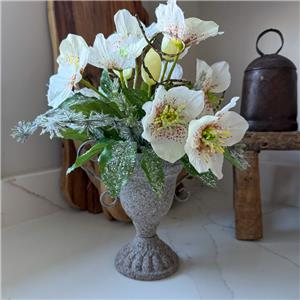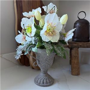 This very pretty frosted white artificial silk hellebore flower arrangement is ideal for adding a special touch to any room. Quality and realistic flowers are designed in a metal urn vase with faux twigs.