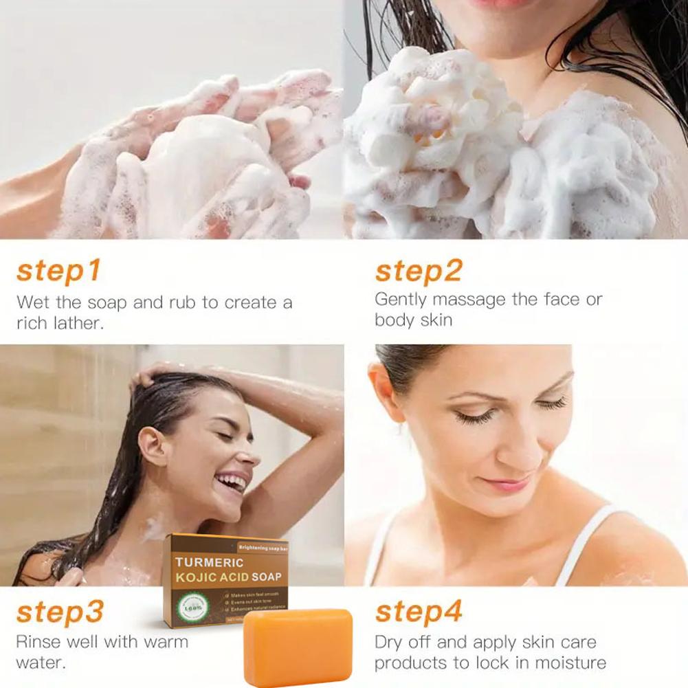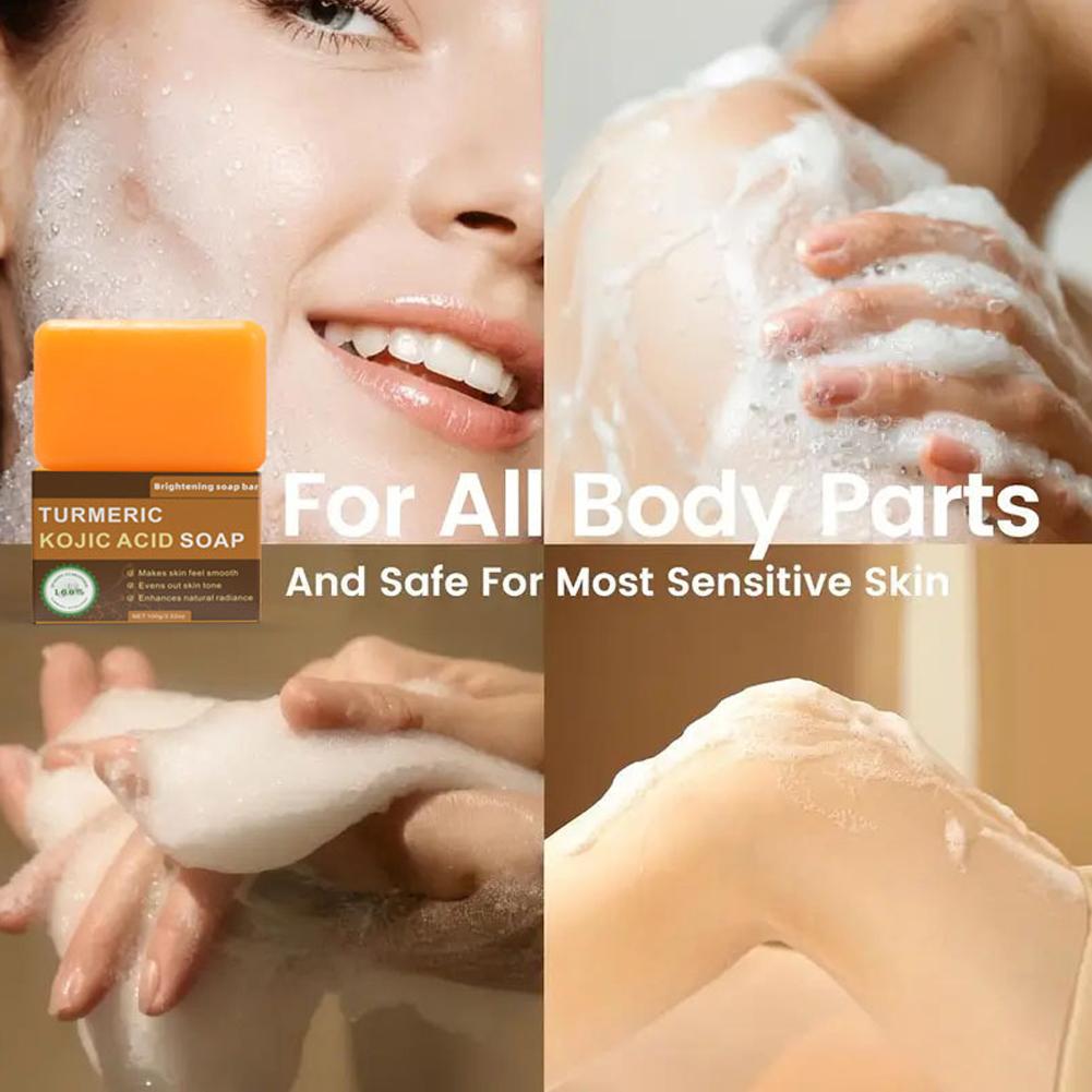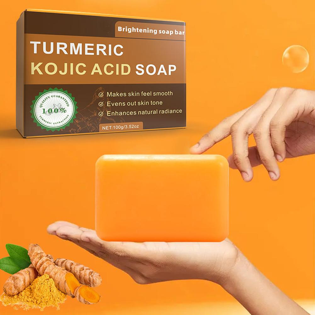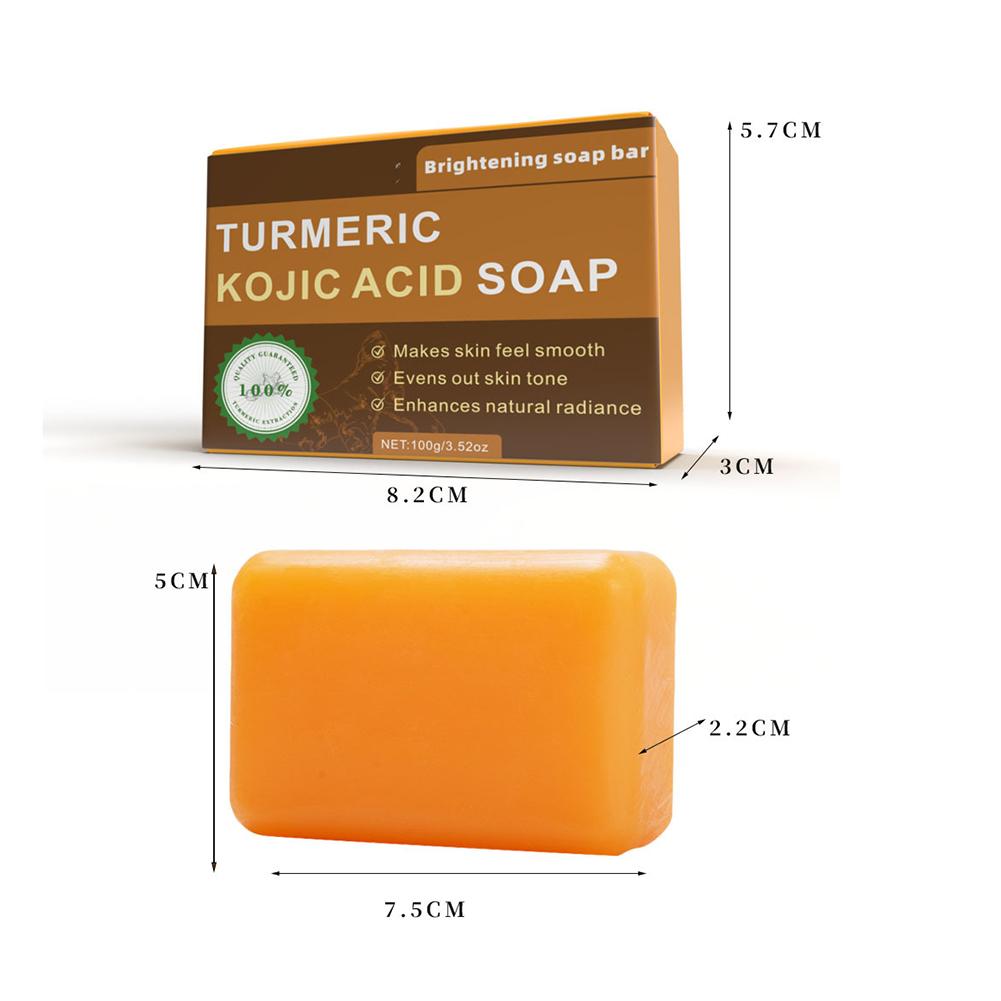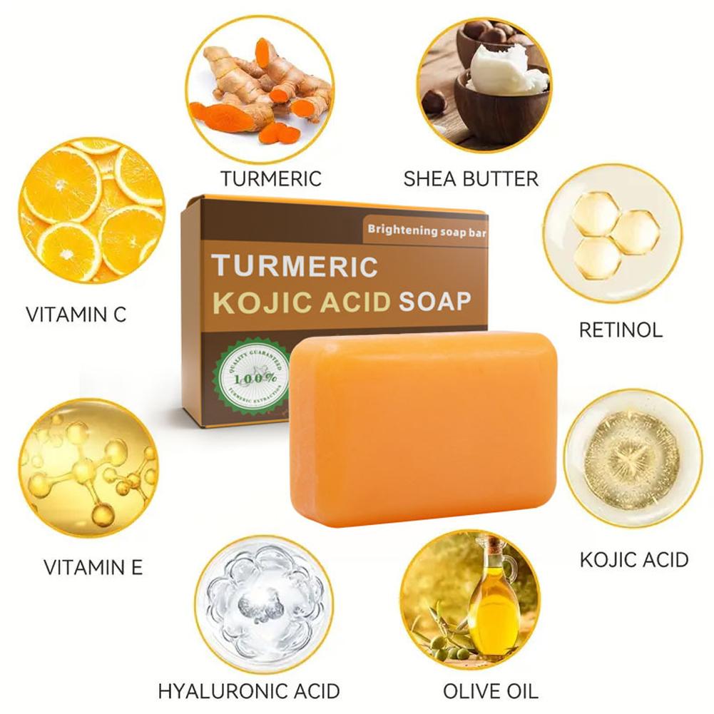 1. Advanced Formula: Our brightening soap bar features a potent blend of Turmeric and Kojic Acid, complemented by nourishing ingredients such as Shea Butter, Vitamin C, Retinol, Vitamin E, Hyaluronic Acid, and Olive Oil, designed to promote a clearer, more radiant complexion.
