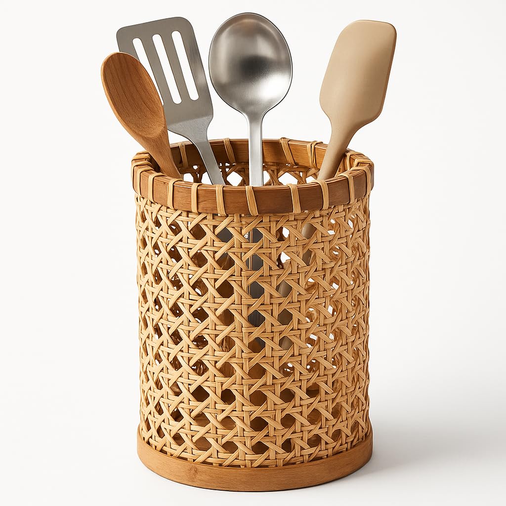Product Description Elevate your kitchen organization with our Boho Rattan Utensil Holder, a handwoven masterpiece designed to blend practicality with artisanal charm. Measuring 12x17cm, this compact yet spacious organizer is crafted from eco-friendly natural rattan, offering a lightweight and breathable structure for storing utensils, cooking tools, or even craft supplies. The open weave pattern showcases the beauty of traditional craftsmanship, while the reinforced base ensures stability on any surface. Whether you're styling a rustic farmhouse kitchen or adding a cozy touch to your countertop, this rattan basket brings nature-inspired texture and function into your home. Use it as a utensil caddy, a holder for office supplies, or a decorative container for dried flowers. It’s the perfect balance of boho flair and everyday utility—an ideal addition to your sustainable living space or a thoughtful gift for anyone who appreciates handmade home accents.