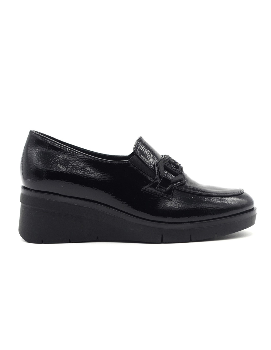 Zapatos con tacón de 7 cm aproximadamente, en charol y ante sintético, con elásticos y banda