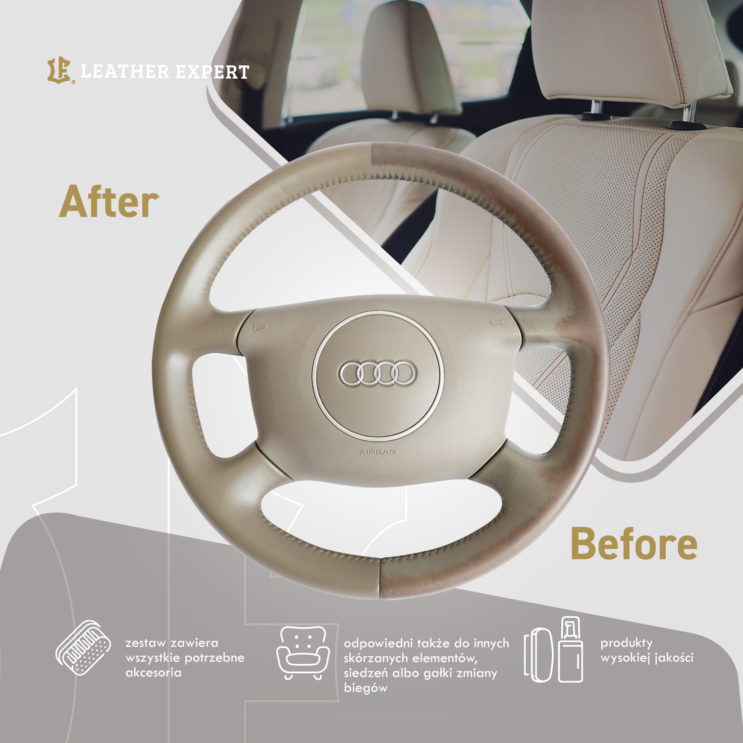 Le kit de restauration de volant en cuir est un ensemble pour Restauration de volants, sièges et autres éléments en cuir . L'ensemble est immédiatement prêt à l'emploi. Il contient des produits de la plus haute qualité et tous les outils nécessaires à la restauration du volant.