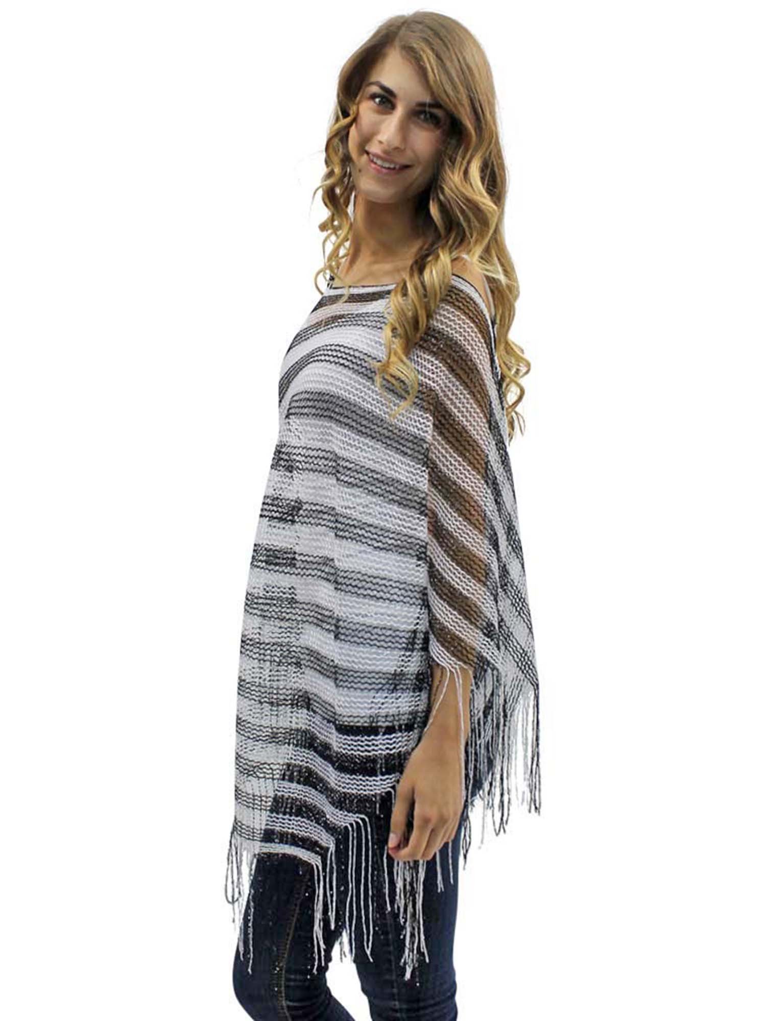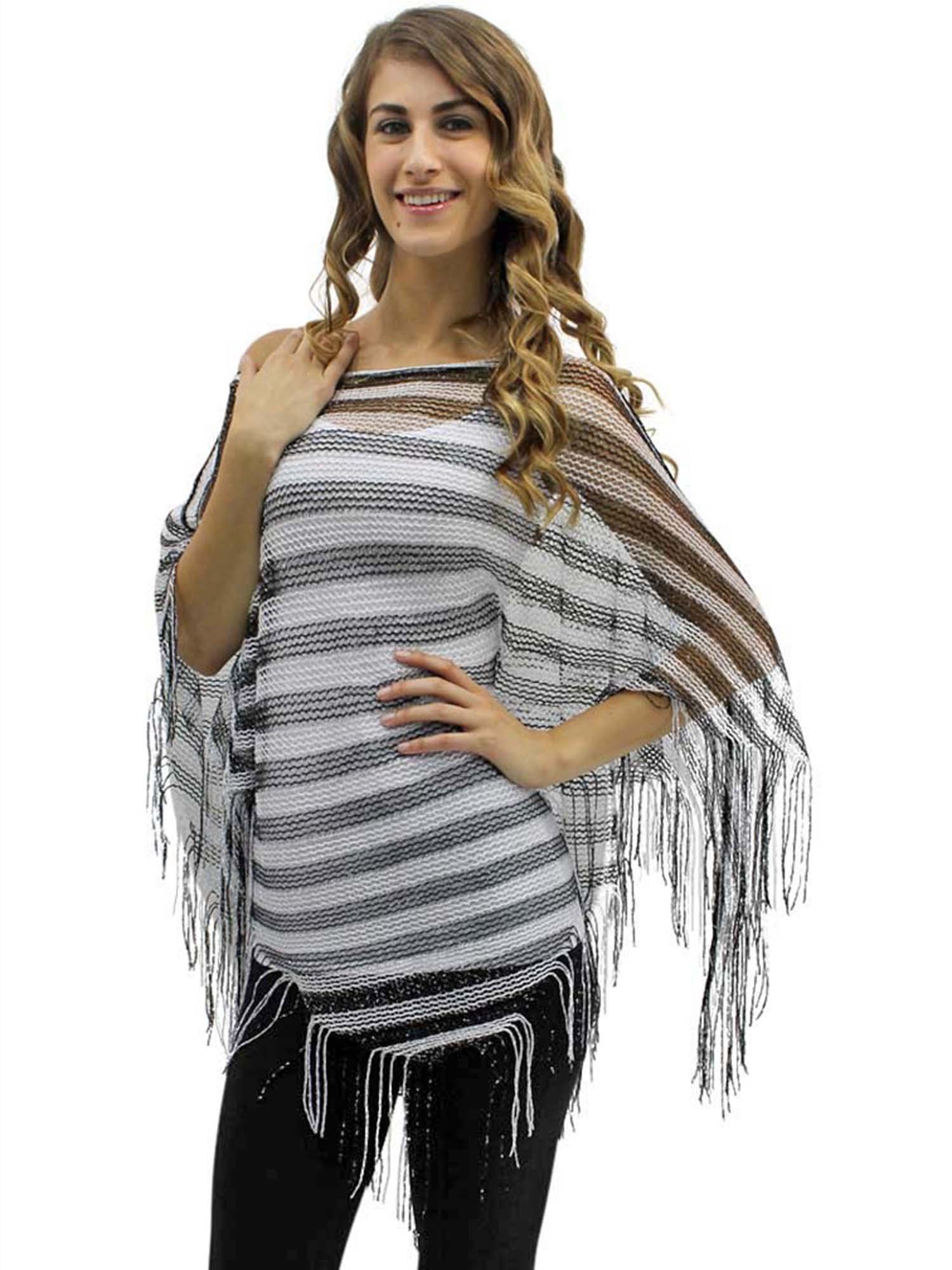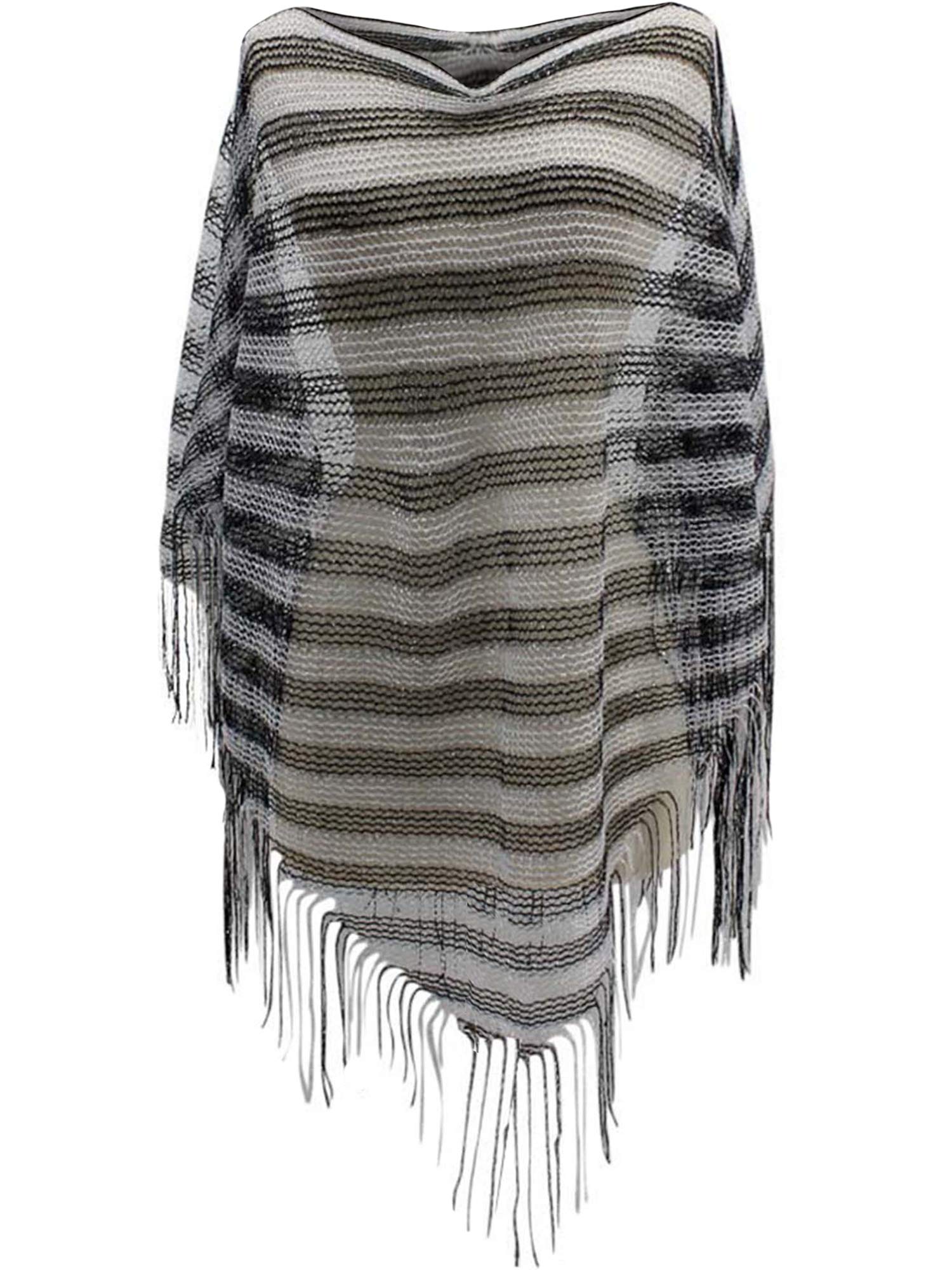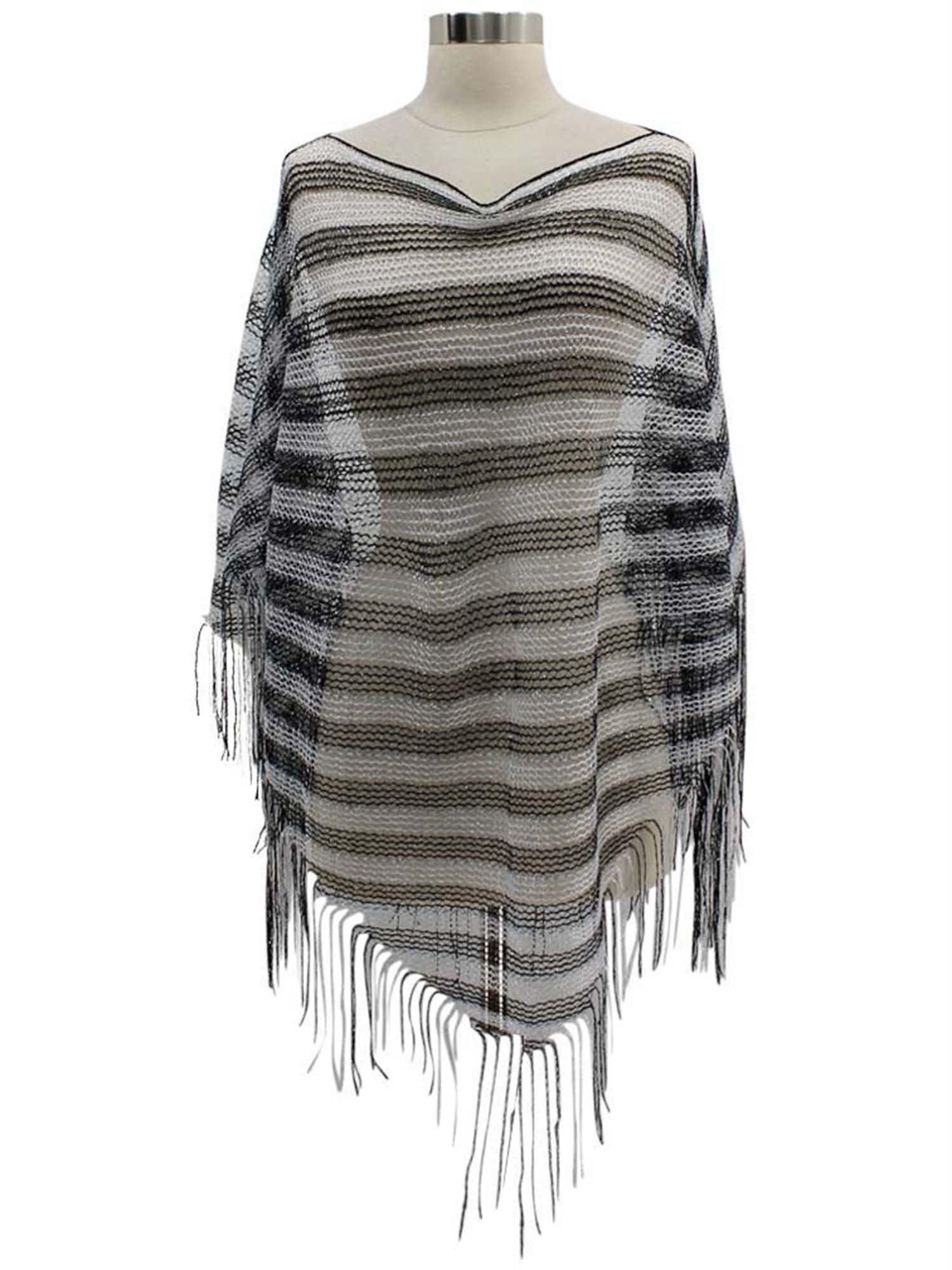 Lightweight triangular metallic poncho adds life to any wardrobe.