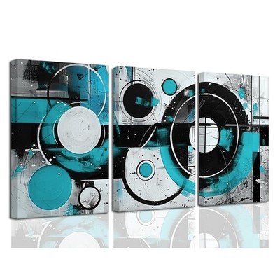 SWQYLB Teal Abstract Wall Art Blue and Gray Canvas Print 3 Pieces Abstract Geometric Circle Black Gray Painting for Home Office Decor Framed (Black, 12.00" x 16.00" x 3PCS)