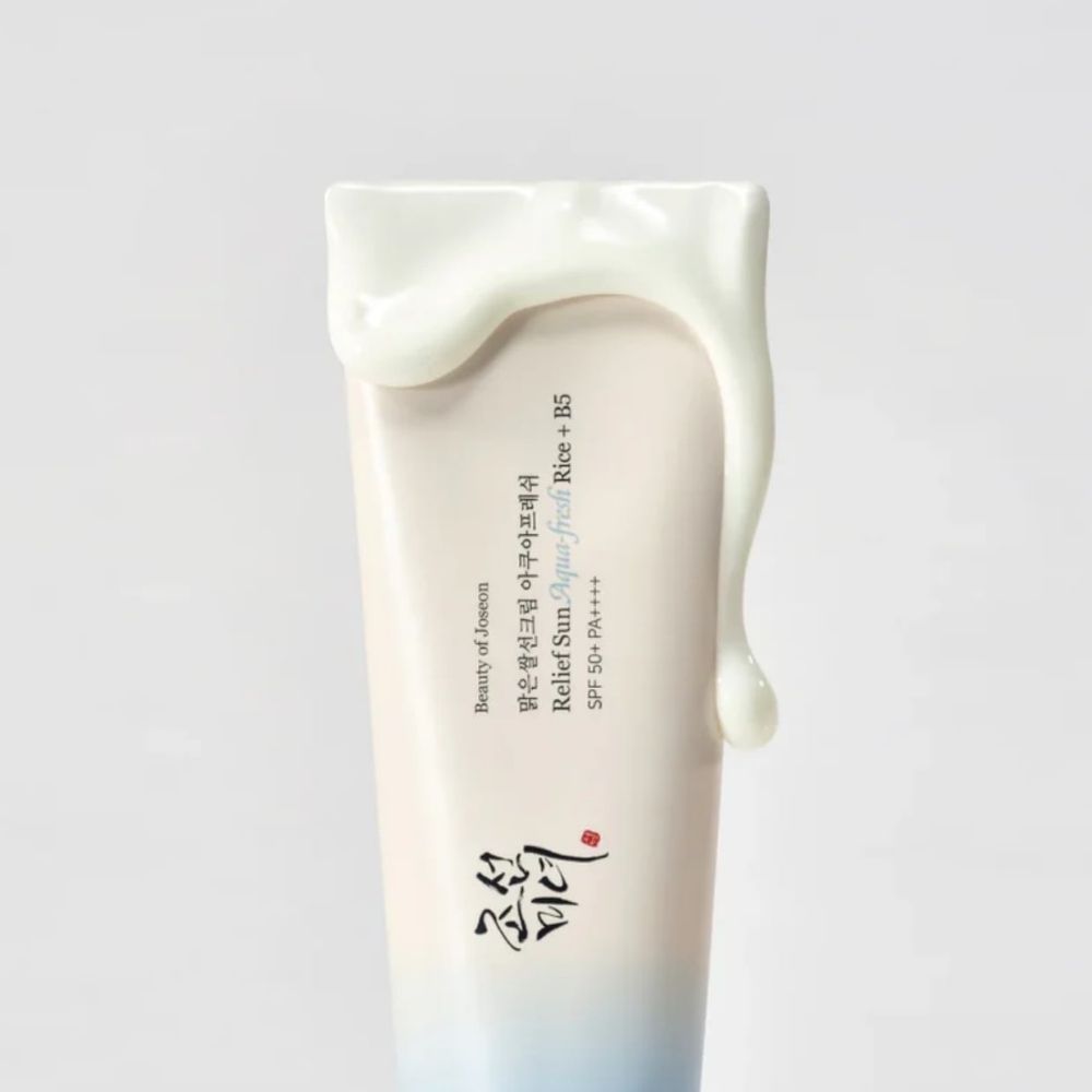 Beauty of Joseon Relief Sun Aqua-fresh Rice + B5 est un léger SPF50 PA++++ s UNS creen enrichi en eau de riz et en vitamine B5. Il hydrate et protège la peau des rayons UV sans laisser de film gras.