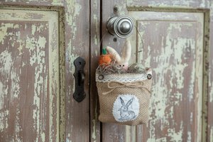 Crafted from rustic burlap and adorned with a whimsical bunny, carrot accent, and dangling eggs, it's the perfect prim touch for your seasonal display. Nestle it in a bowl of decorative grass or perch it on a shelf for instant farmhouse charm. A delightful addition to any Easter vignette.