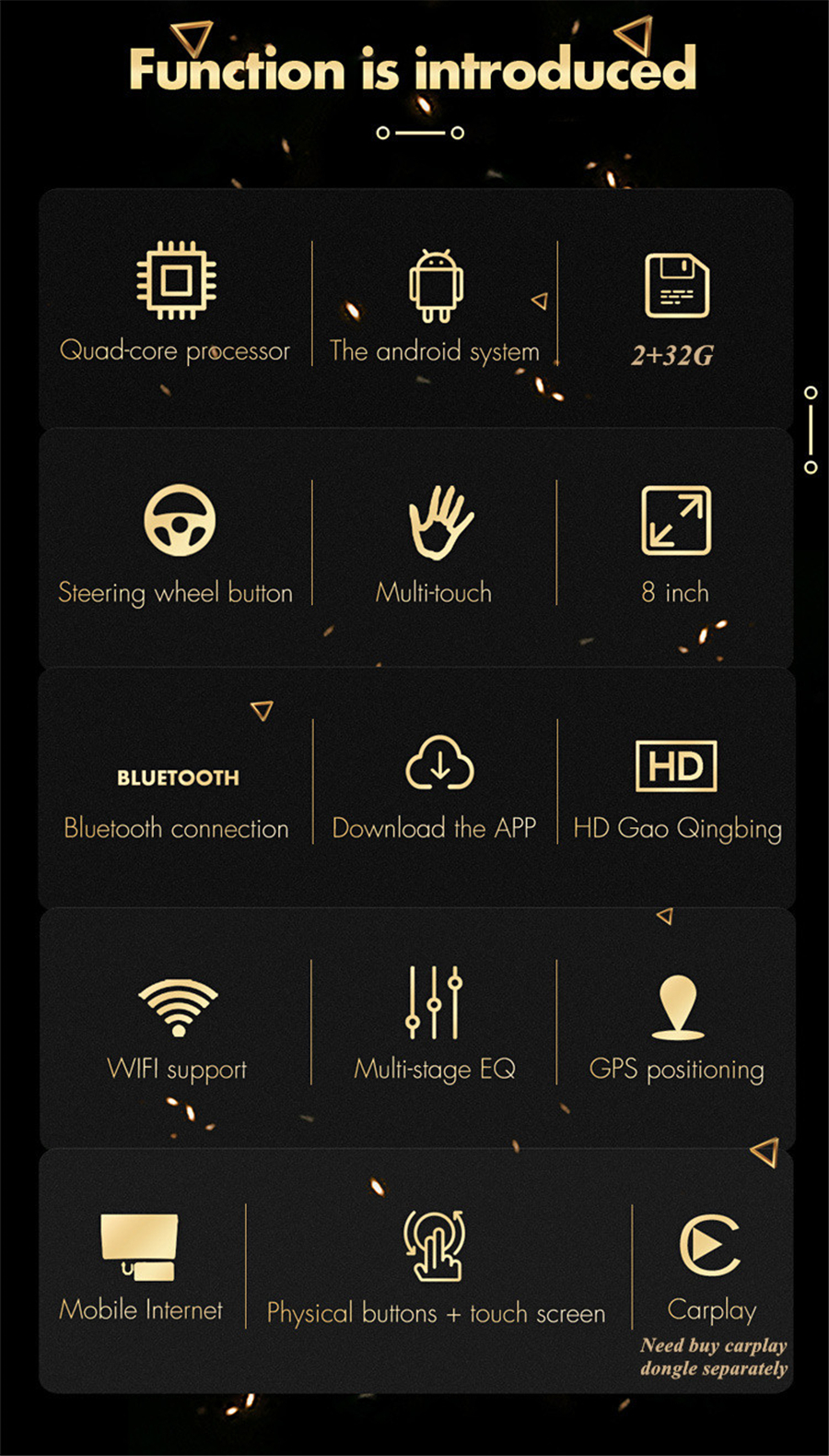 - Textbook: Could change font, font color, background color, bookmark, reading E-book while listening music - Photo Viewer: Support JPS, BMP, PNG, GIF etc. format. play by revolve, Powerpoint Support 4096*4096 Pixels - Wallpapers: 5 live wallpapers, 17 standard wallpapers, support DIY wallpaper from Gallery - APK Installer: Support Android Package installer - Support Torque Pro(OBD2 &Car): Yes, you can connect a Bluetooth OBD2 Scanner Tool to use this function - Support Mirror Link function: Yes, support screen mirroring from iPhone and android smartphone - Support TPMS: YES (Not Included) |