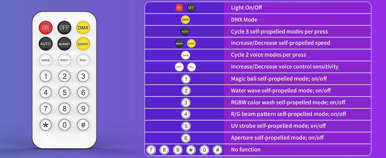 Operation mode: self-propelled/sound control/master-slave/DMX/remote control