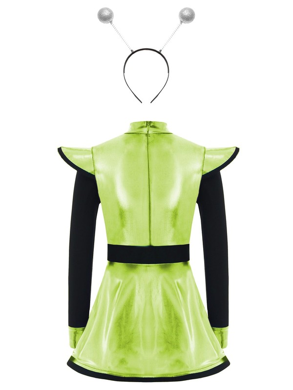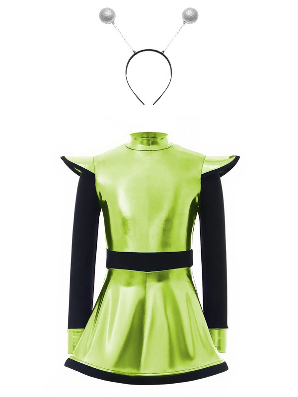 The alien-themed patchwork design with metallic gloss is trendy and eye-catching, making your little girl stand out in themed parties.