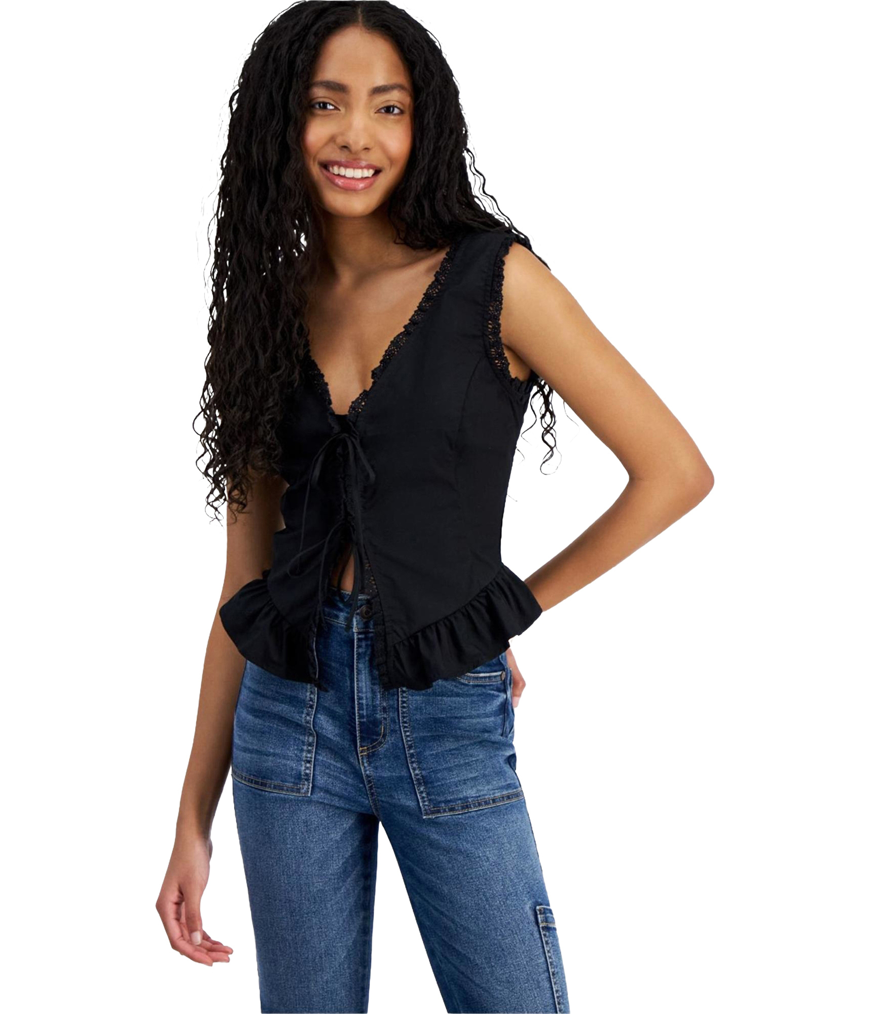 Tailored paneling creates a flattering corset silhouette on this sleeveless peplum blouse. Delicate lace trim edges the V-neckline and ruffled hem, while a charming center tie closure adds playful detail. Crafted from a medium-weight woven fabric with a hint of stretch, this top offers a confident fit that moves with you. It's the perfect piece to elevate your casual look, whether you're brunching with friends or enjoying a night out.